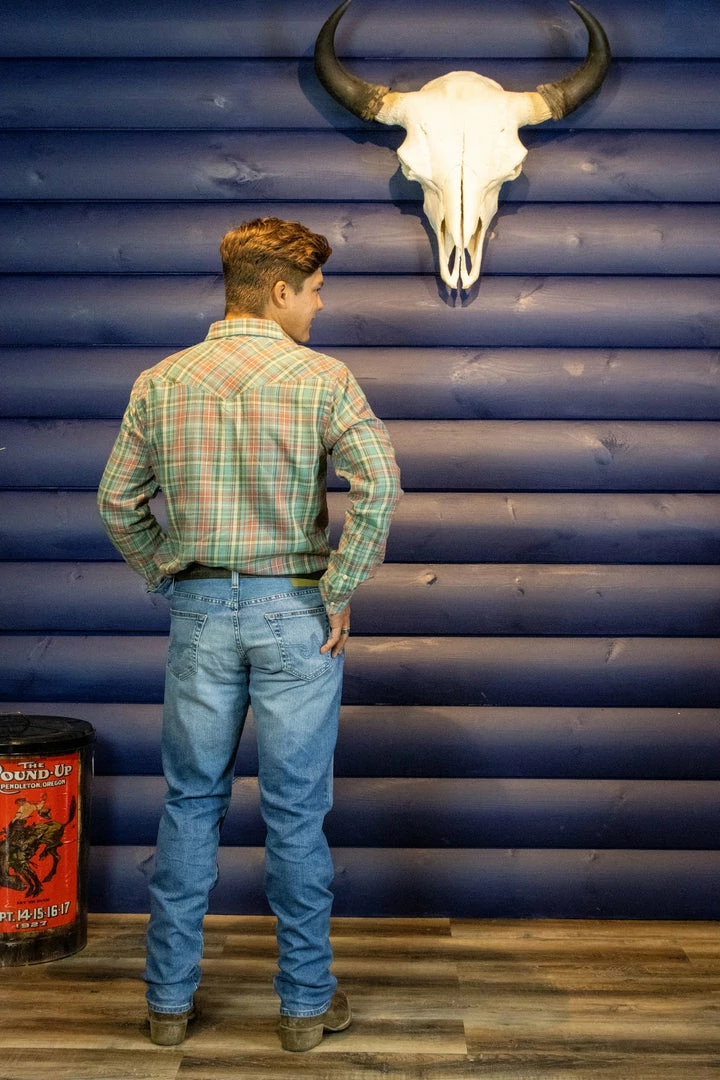 The Graduate Tailored Leg Jean for men features a lived in blue denim wash with placement fading and 3D whiskering, a slim mid rise waist, and a relaxed fit at the hip to the knee before tapering at the leg opening. This men’s slim straight jean is designed in a midweight denim blend with added stretch for a classic, structured feel with comfortable wear.