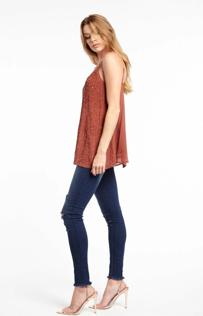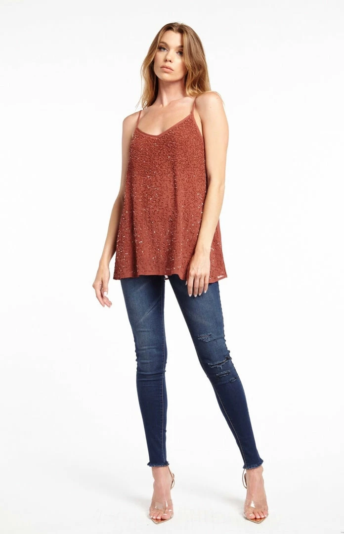 Hand beaded cami, adjustable straps, sheer back, beaded front with a v neckline.