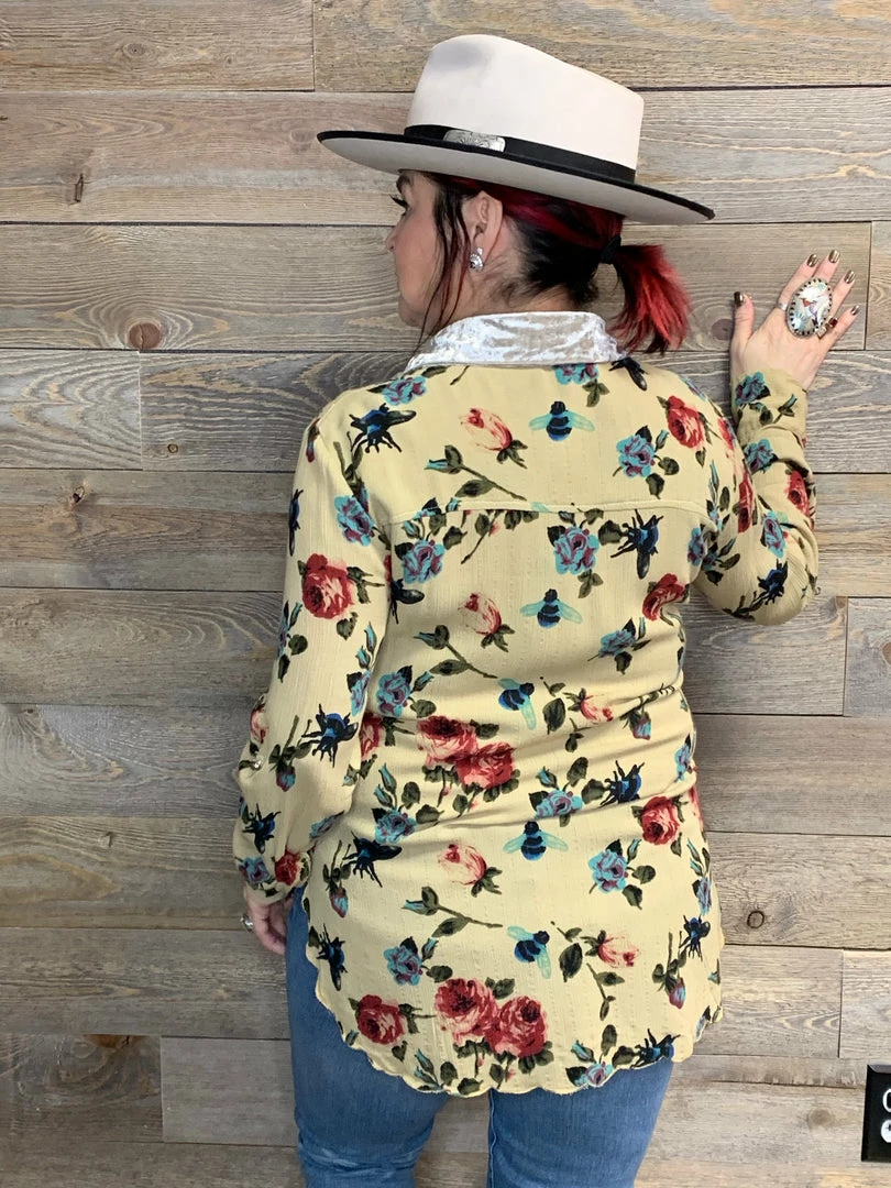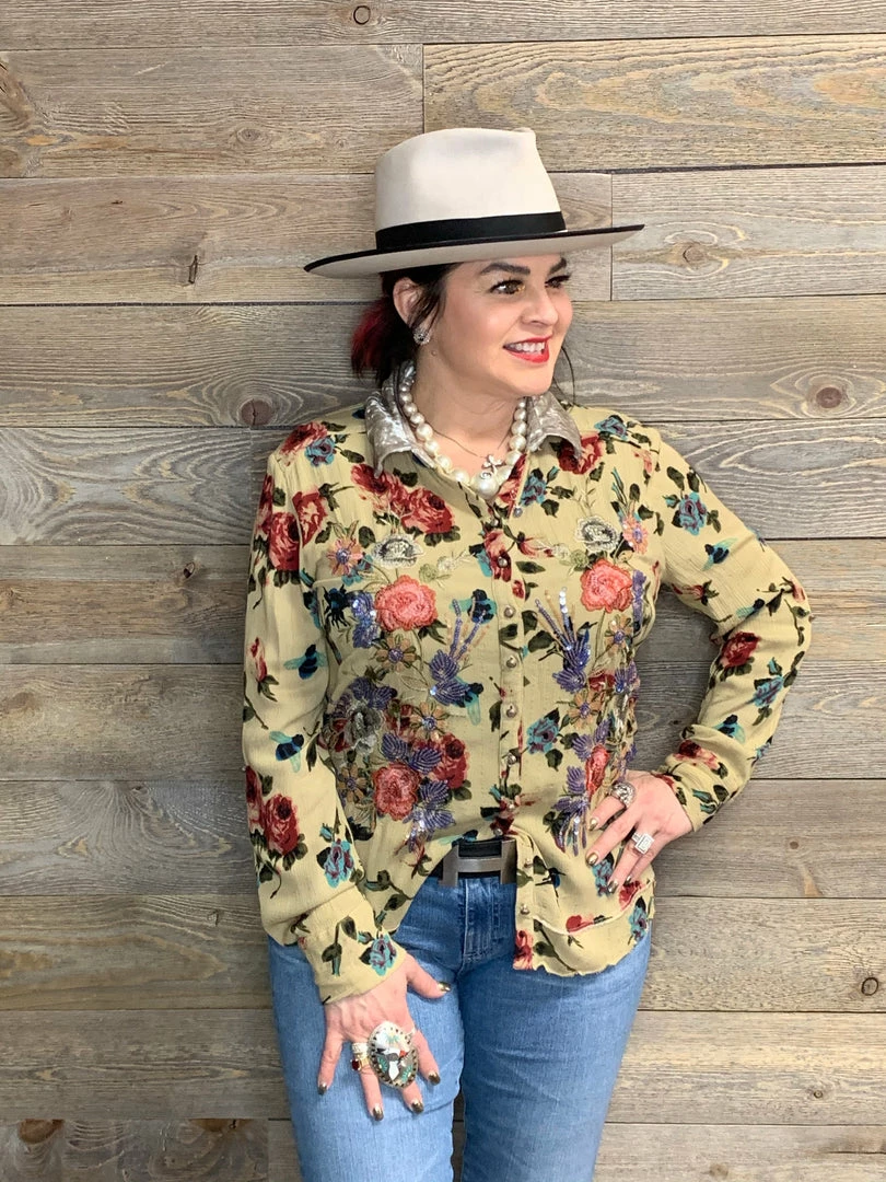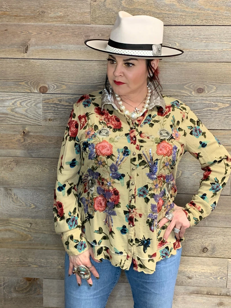 This blouse has feminine all over it! Pretty floral print accented with sequins and embroidery, a velvet collar and scalloped bottom! Dress up or go casual.Â