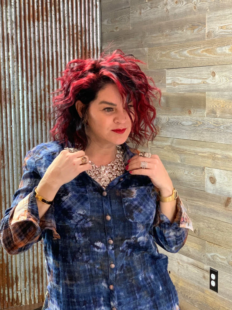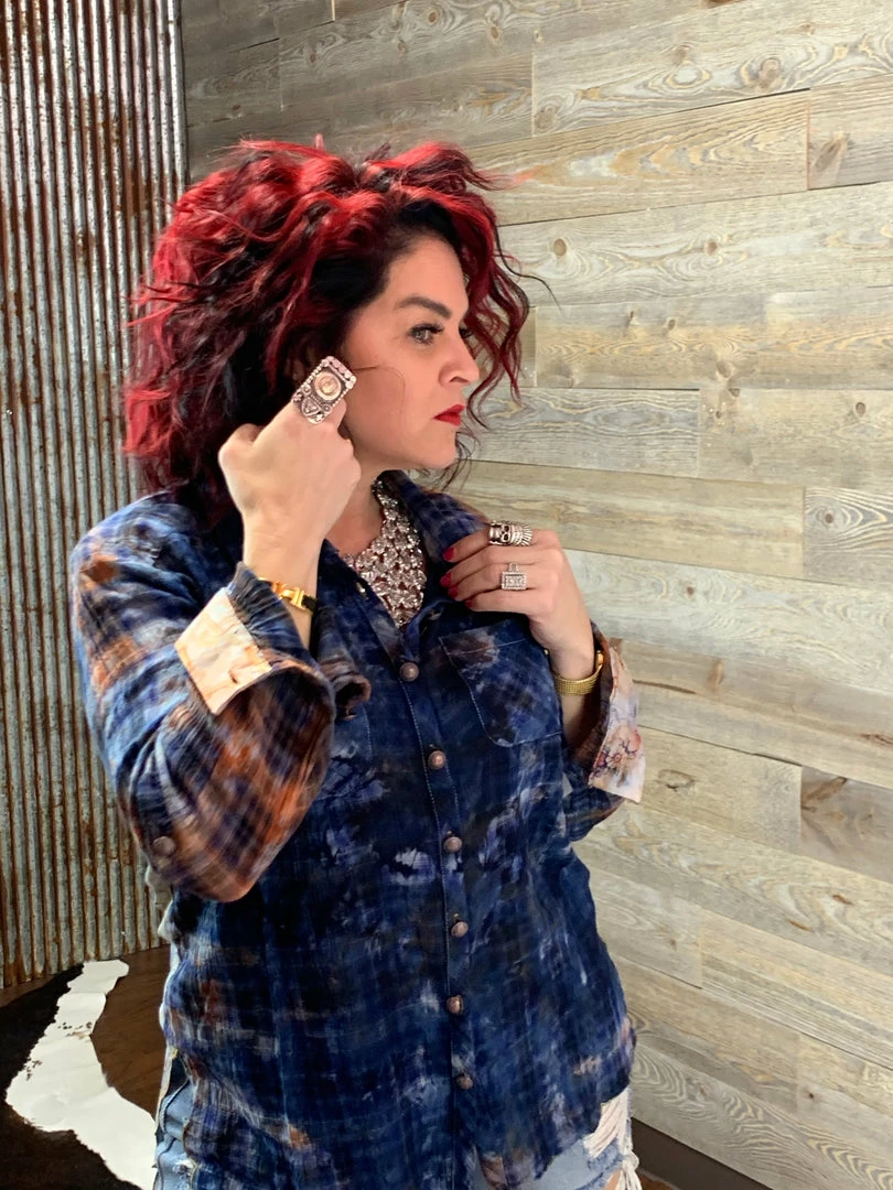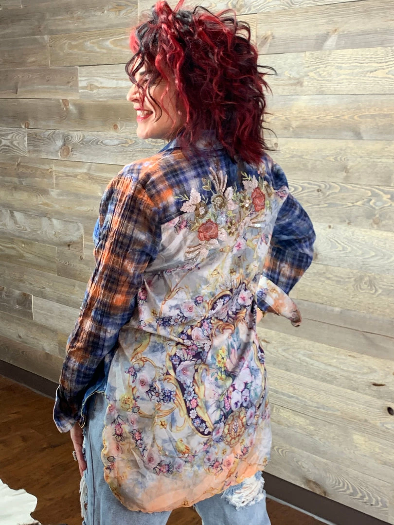 Plaid shirt printed back. Beautiful embroidery and sequins.