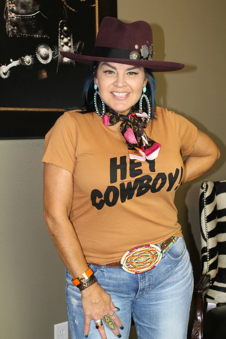 Hey Cowboy!  Are you ready for the WNFR?  You need this graphic tee for sure!  PS you can find the gorgeous beaded buckle under Tex’s Line/Accessories on our website!!!Â