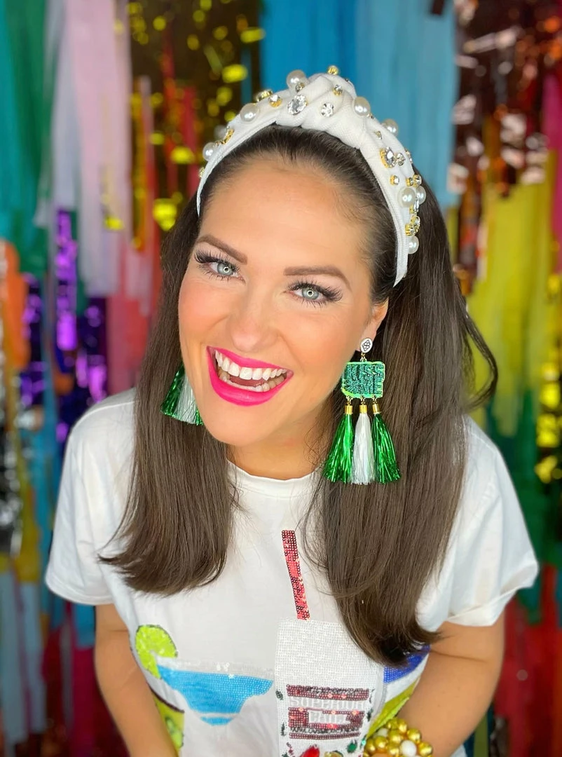 - White twill headband with large crystals and pearls