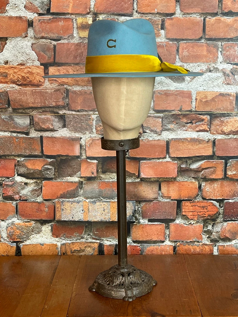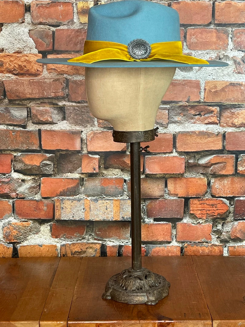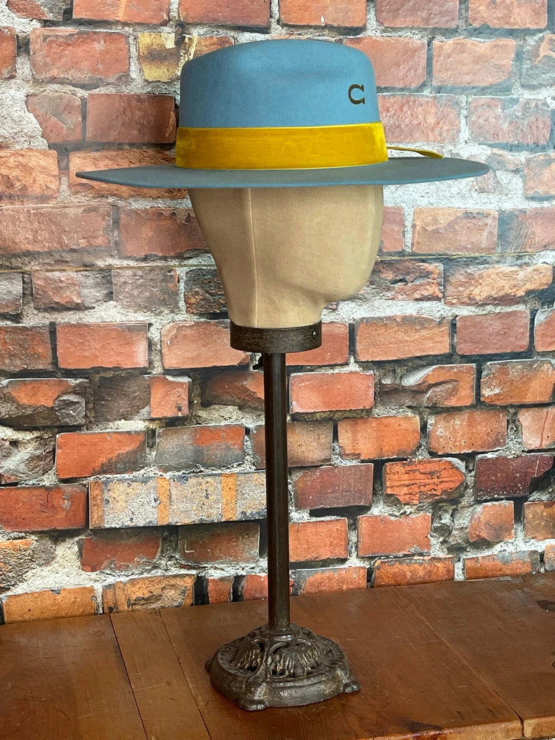 The Charlie 1 Horse Baby Blue Sundance features a unique and fun crown, beautiful mustard velvet band with a concho hat pin and the signature Fire branded “C” logo on the crown!
