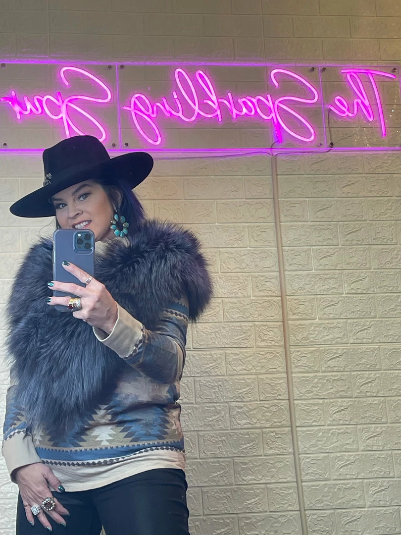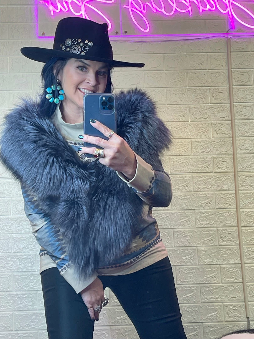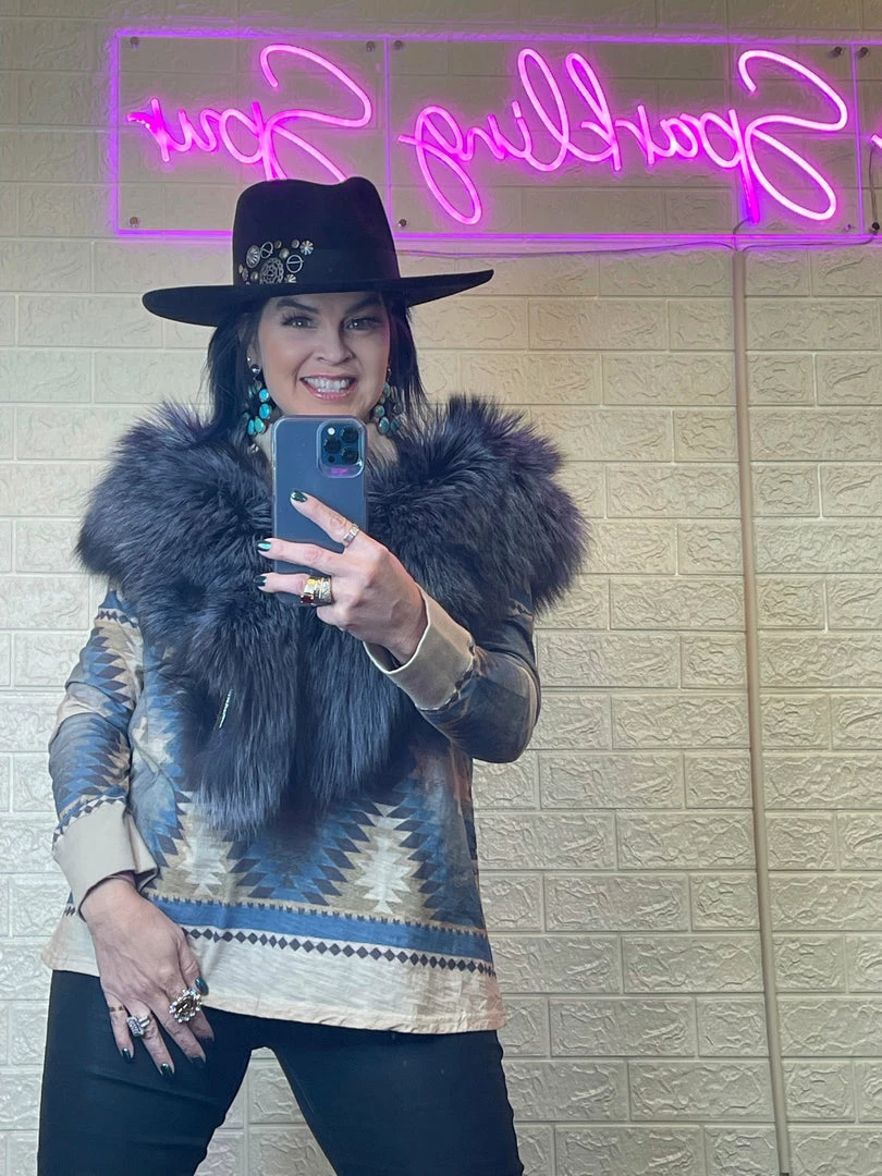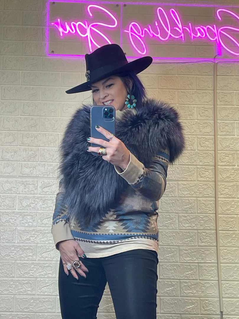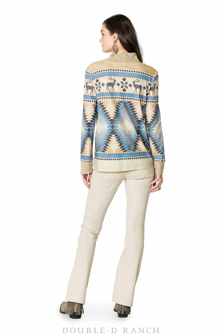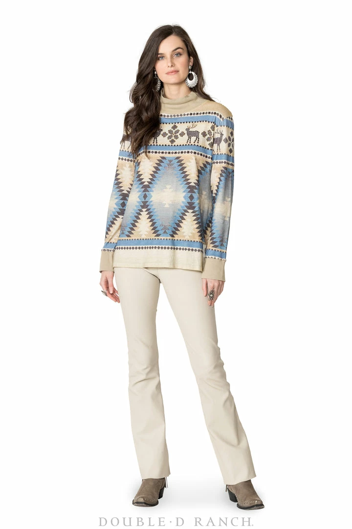 There’s a lot to love about this little number. It’s a lightweight, long-sleeved cotton top that has statement sweater vibes with a bold geometric pattern and a band of deer designs. It has a relaxed fit with a mock-turtleneck and soft shades of warm browns and baby blues that are perfect for the season.