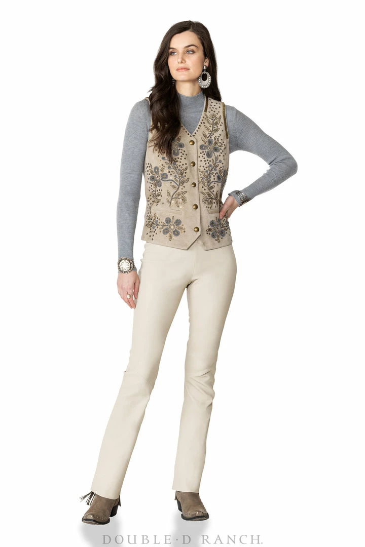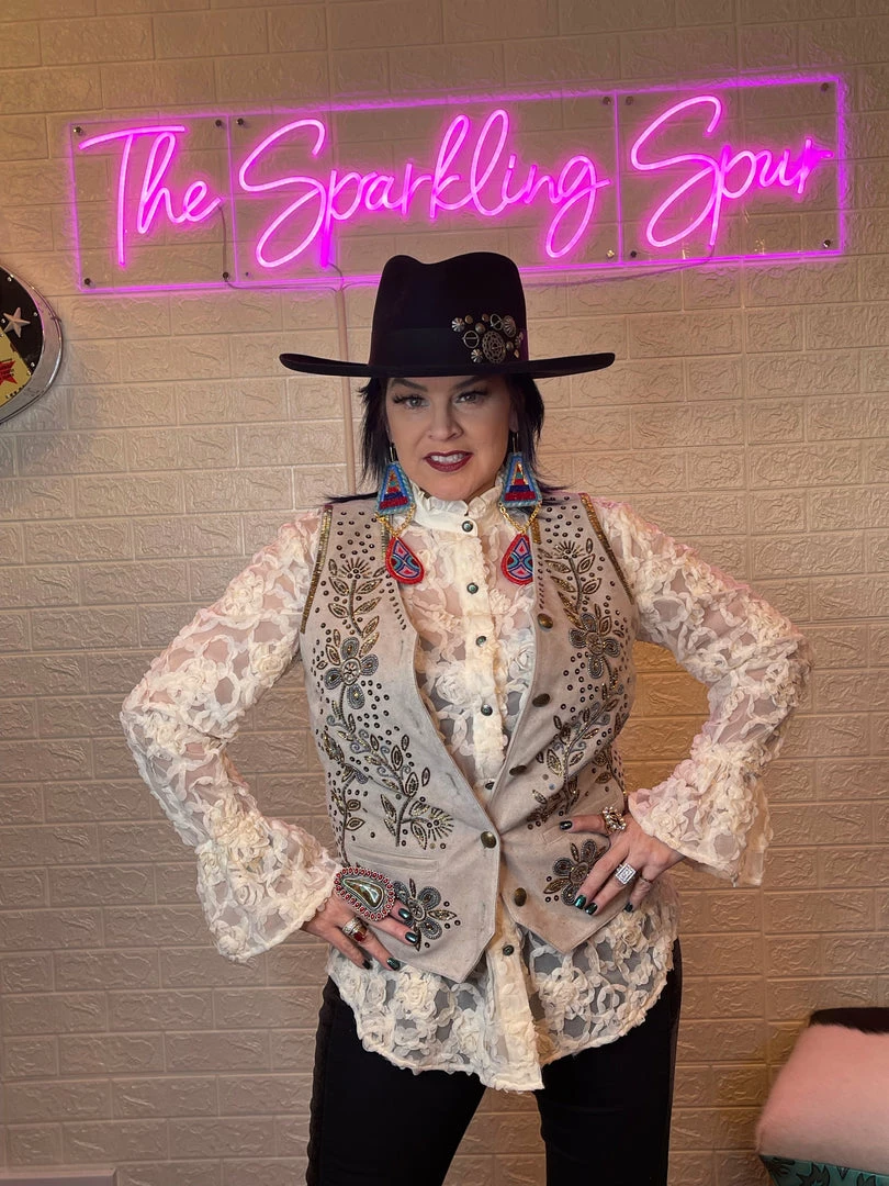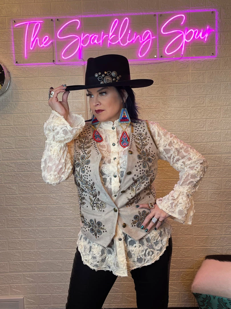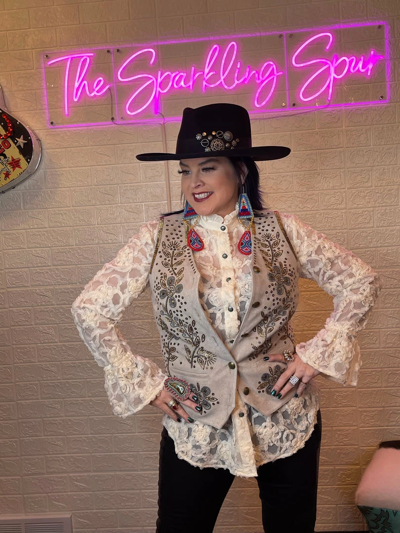 Nothing pulls an outfit together and makes you look perfectly polished like a statement vest, and this one is ready to rock your winter wardrobe. The soft suede is given a glitzy glow-up with sparkly floral beading and finished with sequins, studding, and custom concho buttons. A little bit of flash and a whole lot of fabulous!