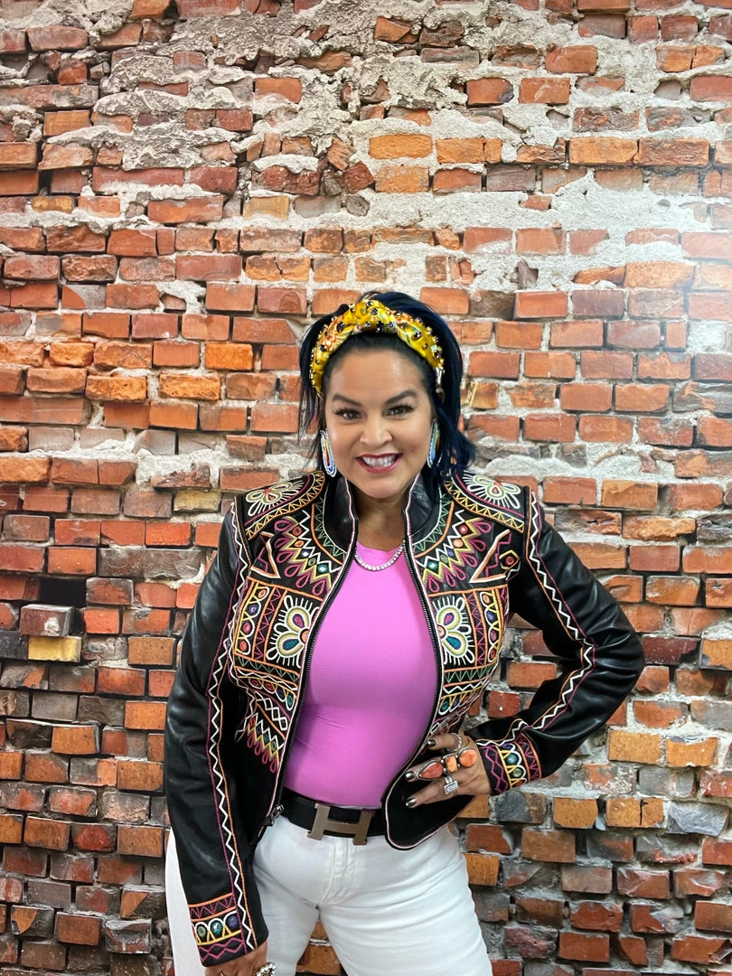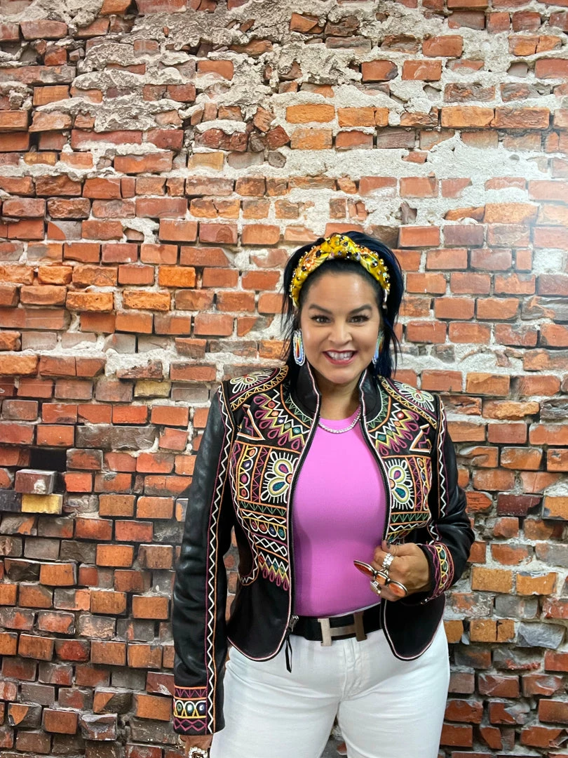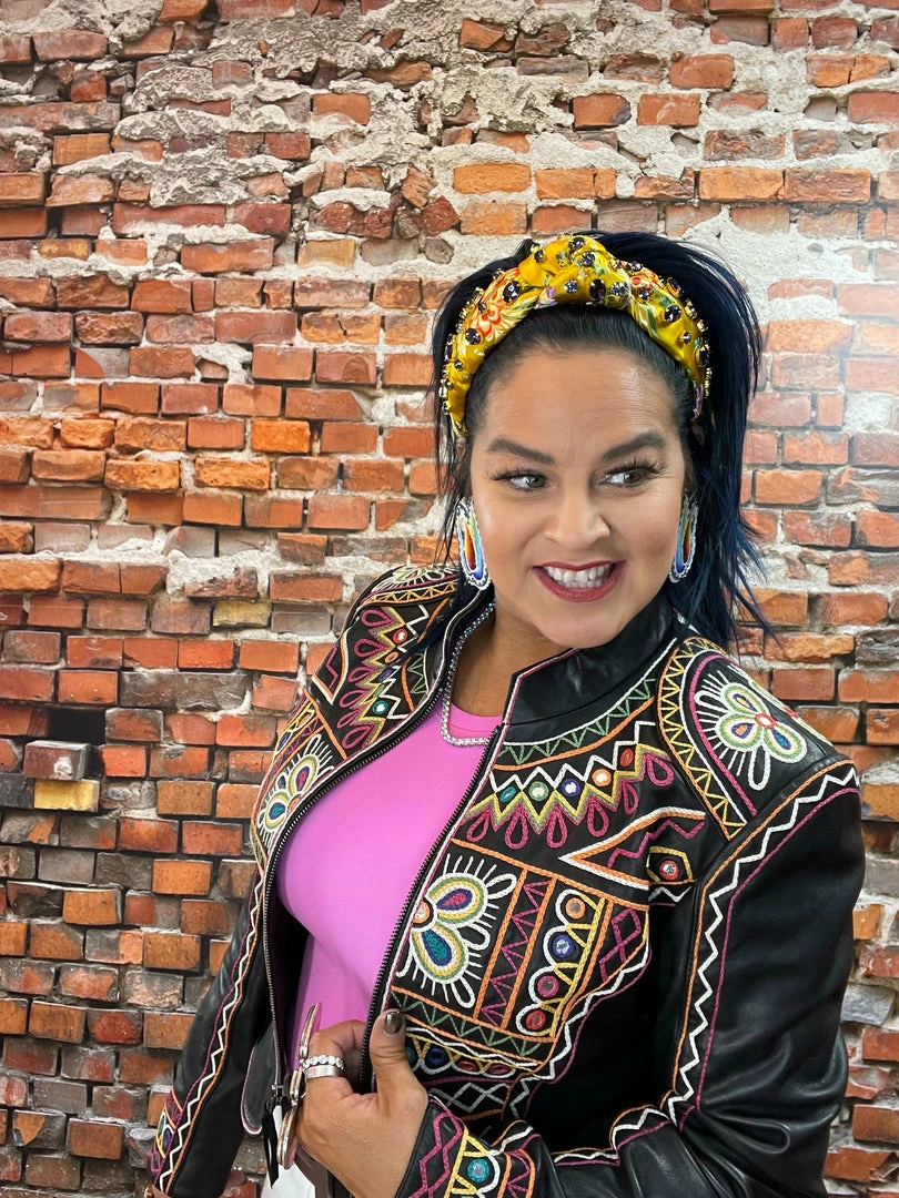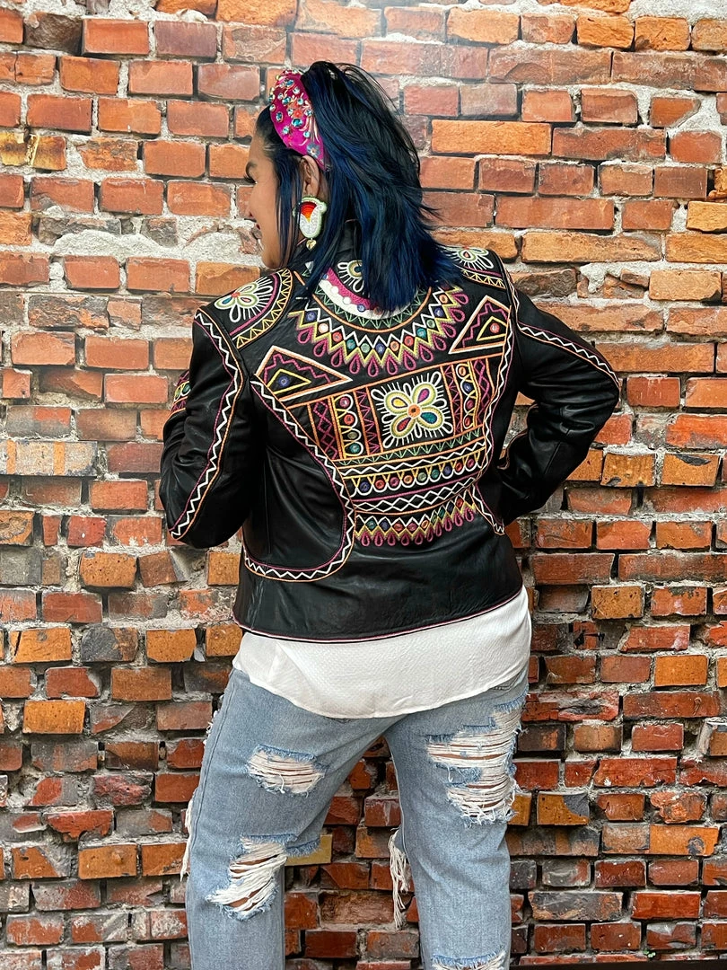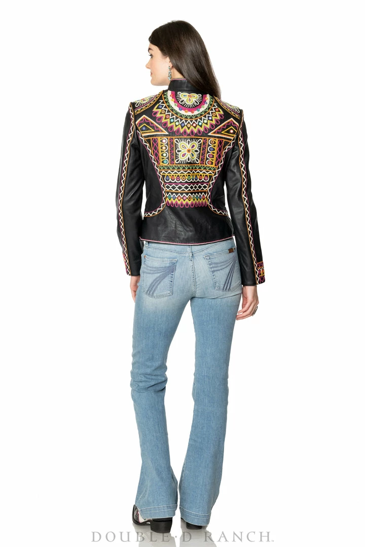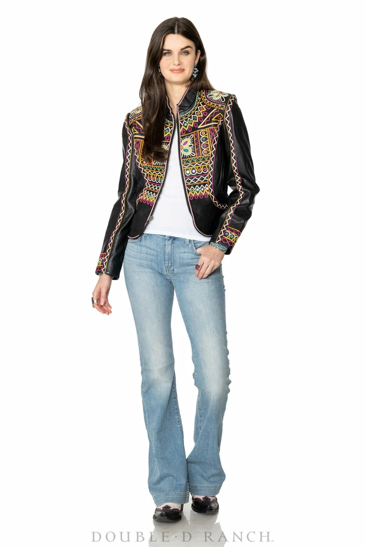 The “Festival of Colors” is an enormous and very vibrant annual celebration in India (that’s actually taking place right about now-ish, March 18th) which involves the tossing, spreading, and smearing of vividly colorful powders, leaving festival-goers covered head-to-toe in lively hues. This jacket incorporates those bright colors as well as intricate geometric embroidery inspired by the folk art aesthetic from that part of the world. You can’t NOT feel joyous in this jacket – it’s like wearing a party!