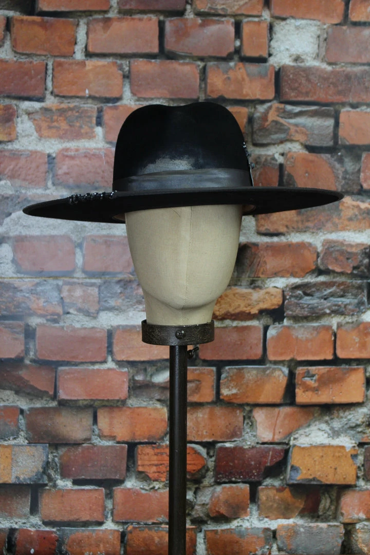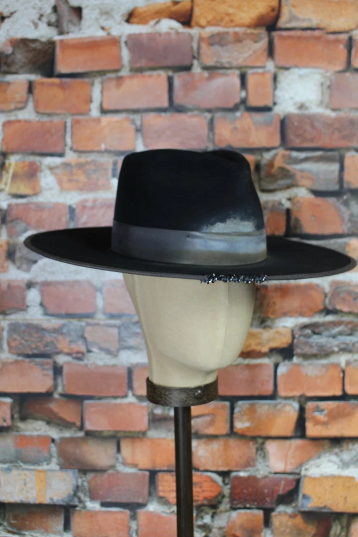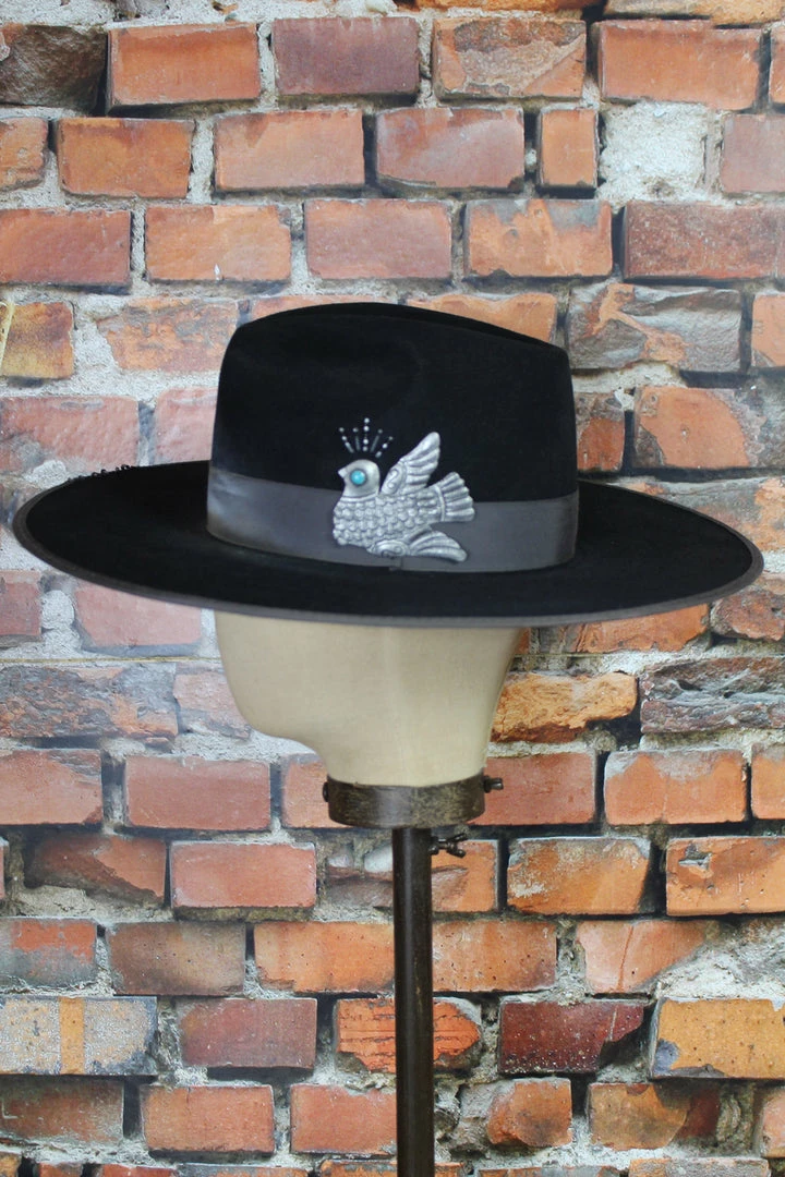 A cross between a men’s fedora and the classic cowboy hat, the large flat brim is the trendiest hat is women’s wear right now. Featuring a pinched fedora crown, a broad 4-inch brim, grosgrain band, silver dove Milagro and light hand-beading.