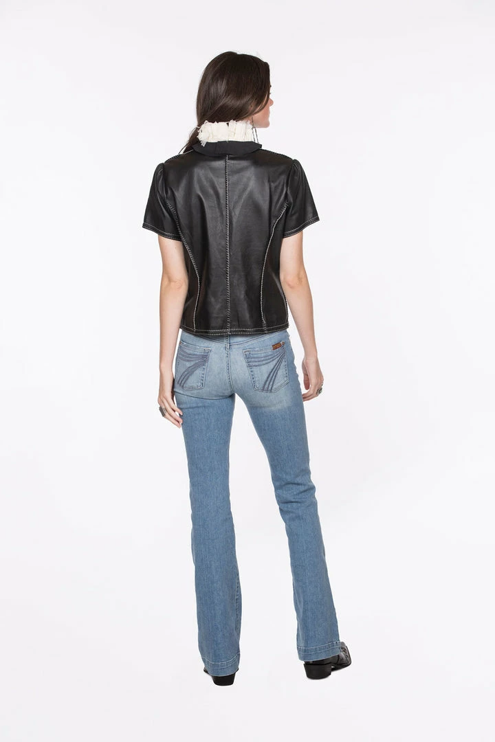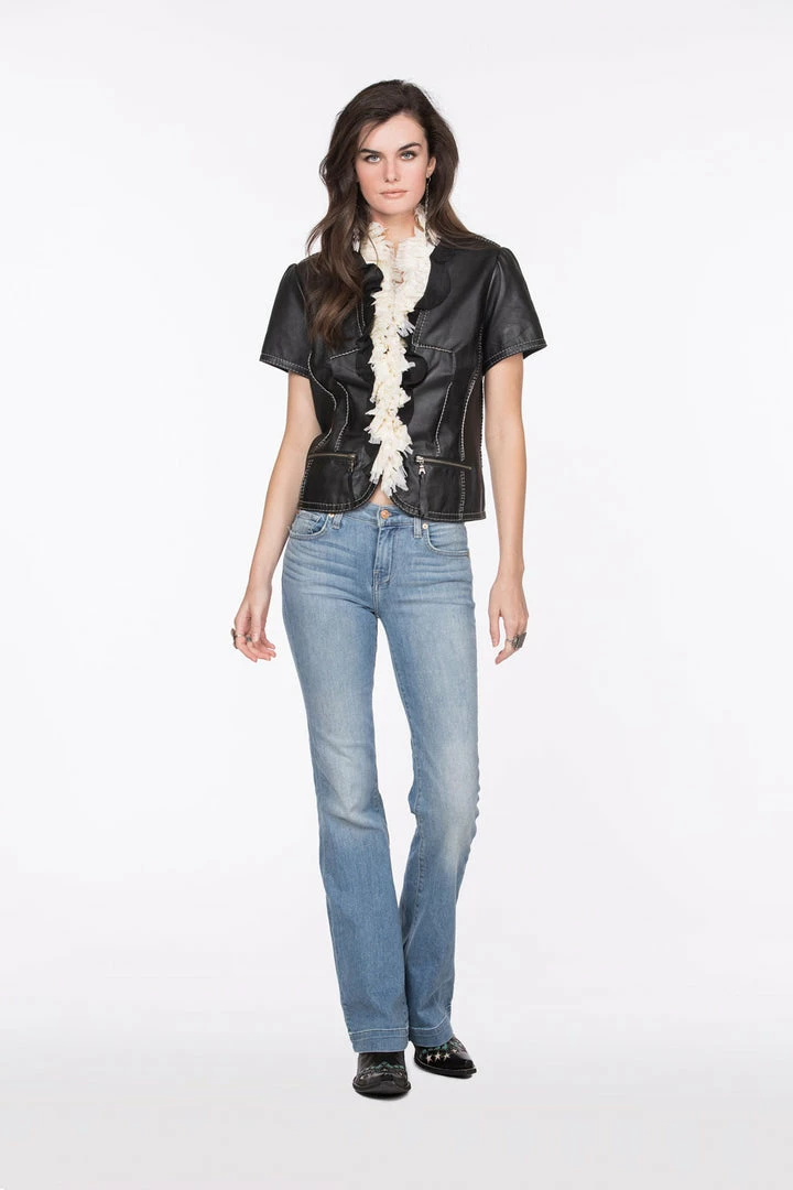 Fun, feminine, and flirty!  This unique beauty brings you an unexpected silhouette with its short sleeves (you don’t often see that in a leather jacket!) and it’s voluminous ruffles edging the collar and placket.  It’s a gorgeous statement jacket.