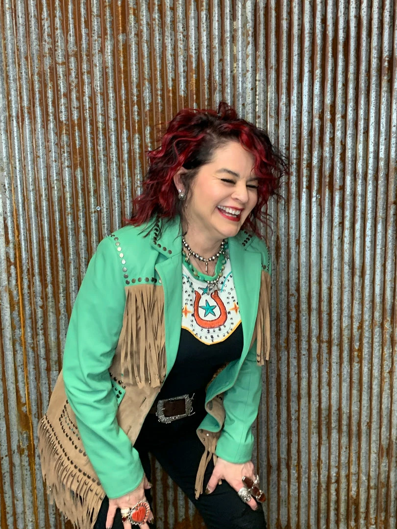 Lucky you!  This colorful fitted tee features fun, funky hand-embroidered pattern of stars, a couple of martinis, and horseshoe for good luck, trimmed with contrasting collar and cuffs.  It’s a fun tee to throw on with your favorite pair of jeans to tackle your day in style.