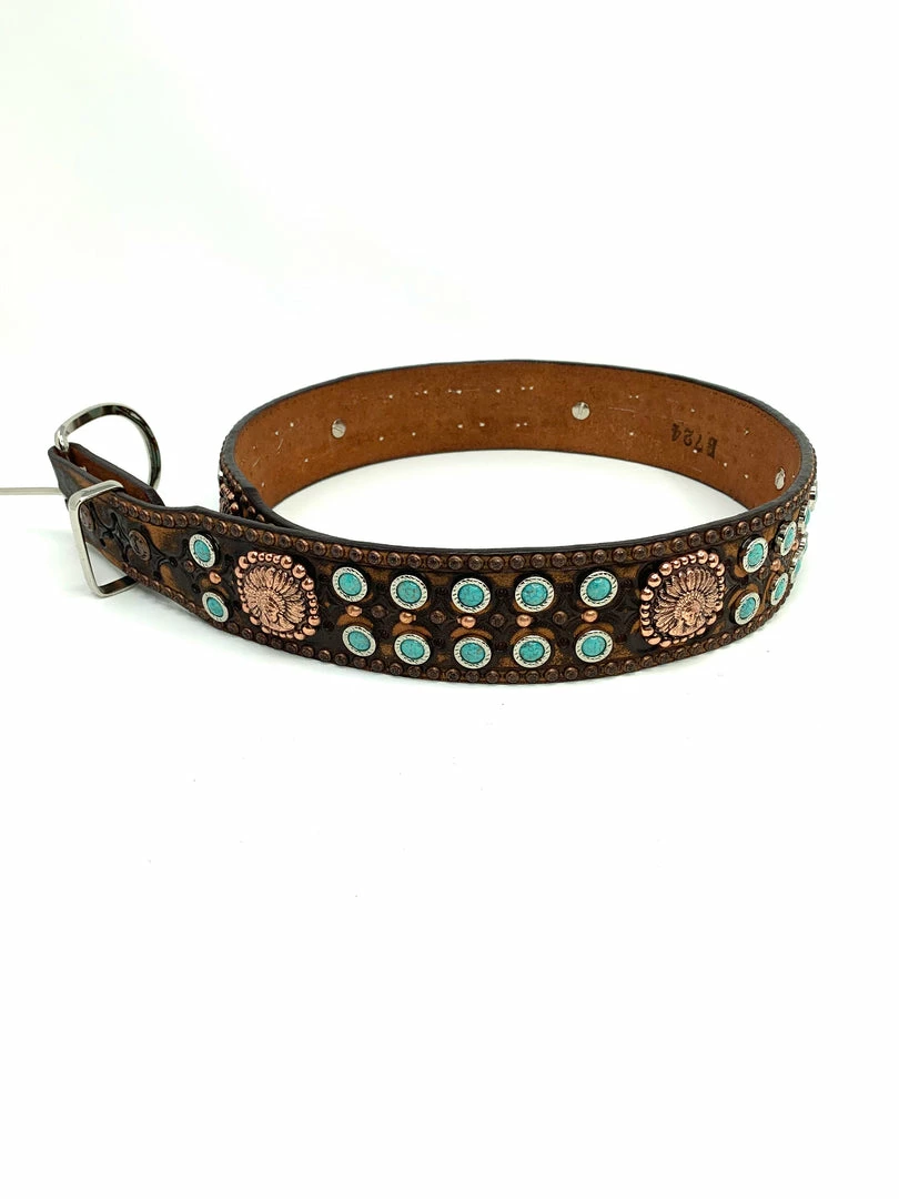 Vintage tooled belt with antique engraved copper dots along both edges, 2 rows of turquois matrix stones and copper indianhead conchos.