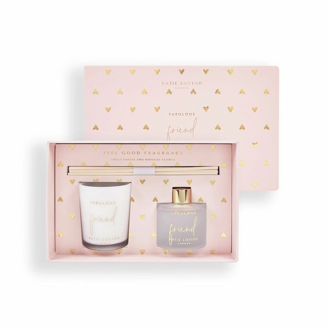 - This ‘Fabulous Friend’ Sentiment Mini Fragrance Set includes a mini candle and mini reed diffuser nestled in a beautiful gift box, featuring the sumptuous fragrance of Sweet Papaya and Hibiscus Flower.