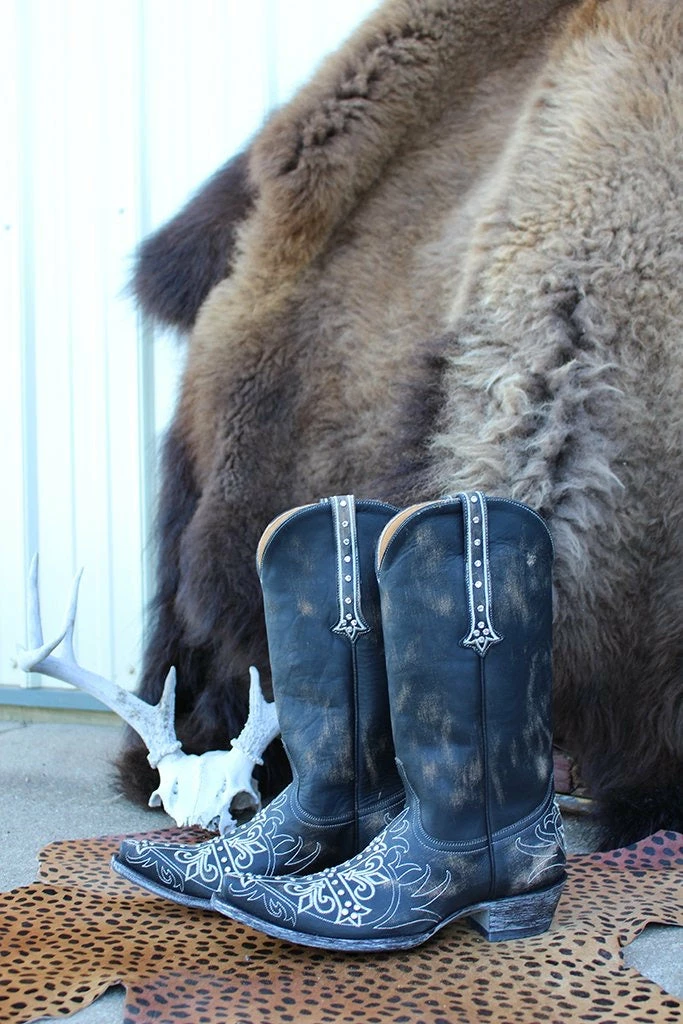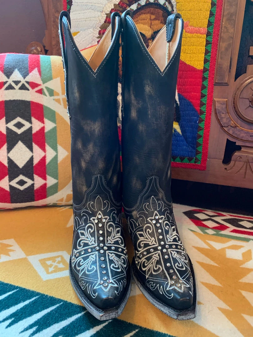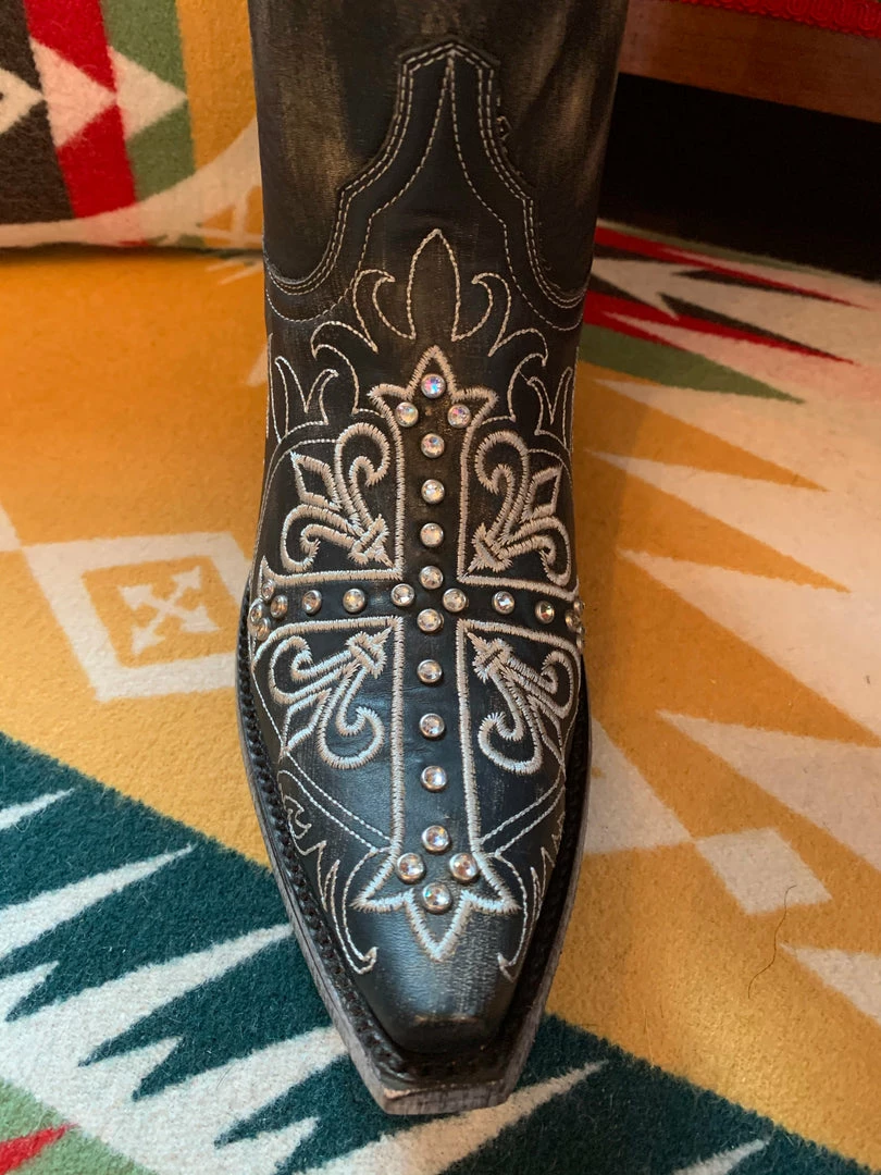 Distressed black leather with beige cross, fleur de lis details and genuine Swarovski accent crystals. 10″ leather shaft. Heel height 1.75″