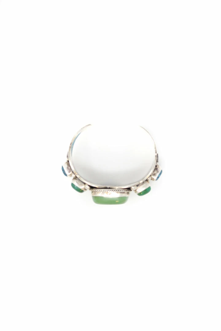 This sterling silver cuff features one large green Persian Turquoise stone, two Jade stones and two Morenci Turquoise stones. Designed by Guy Hoskie.