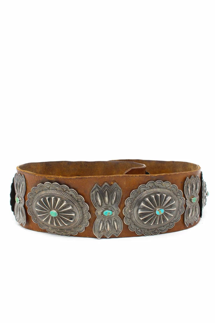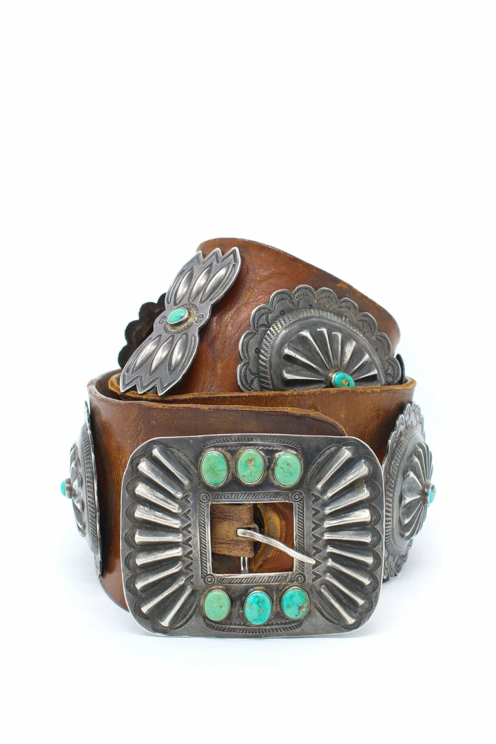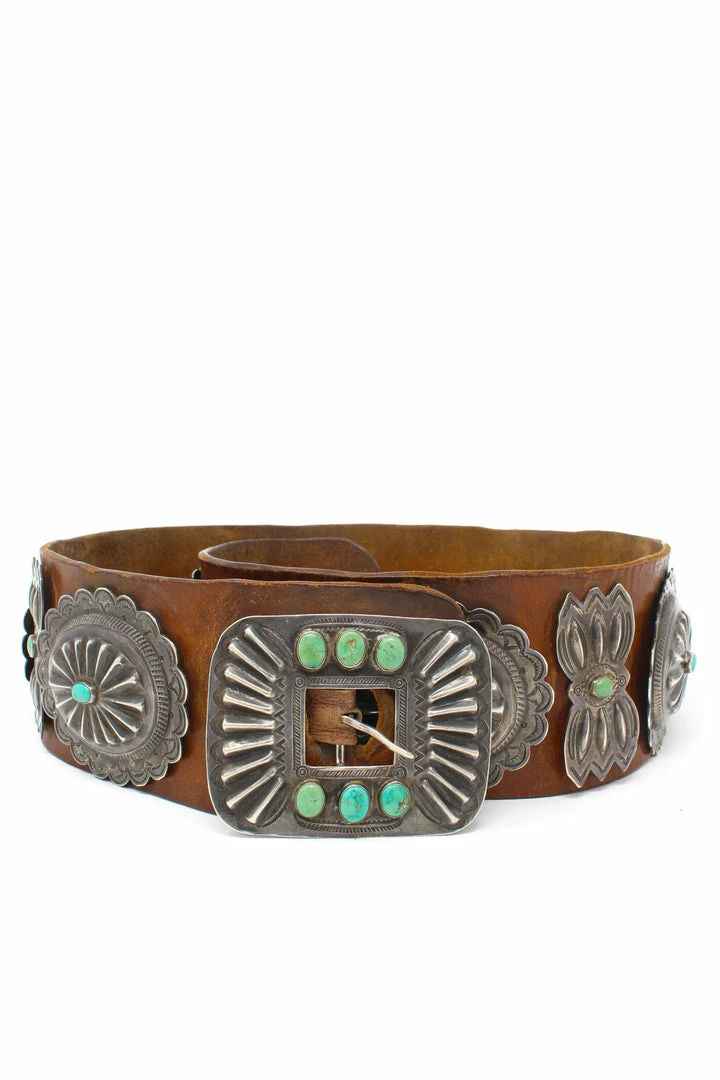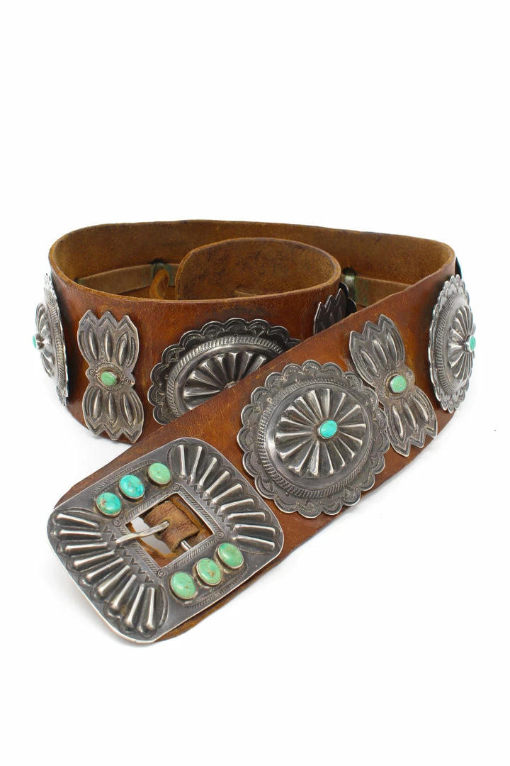Leather belt with sterling silver conchos and turquoise stones. Dates back to the 1940’s!