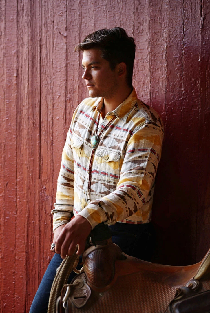 Brushed cotton, blanket jacquard shirt has a soft flannel feel to it making it perfect for cooler weather. Accented with contrast stitching and finished with horn snaps.