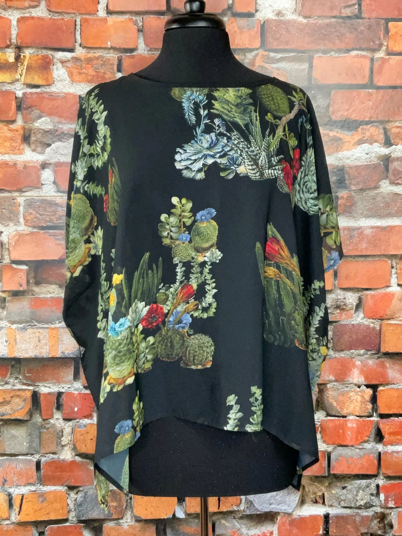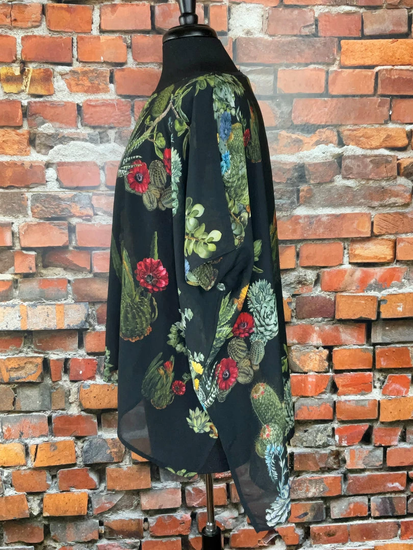 High-Low chiffon poncho. The colorful cactus flowers are stunning with the black background.