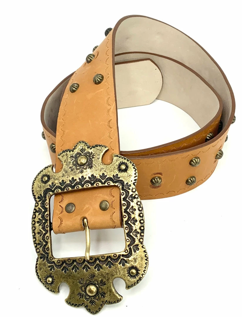 Simple and functional. This belt is adorned with metal accents and a stamped design along both edges. Â