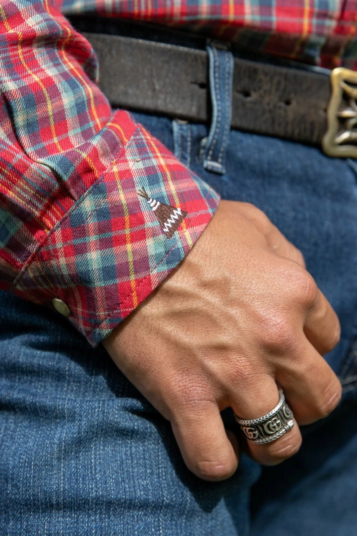 Tasha Polizzi has added a men’s line!!!  The Rider Shirt is a Denali plaid shirt with a western yoke in front and back. Denim on inside cuff and TP signature embroidered teepee on the outside of the cuff.