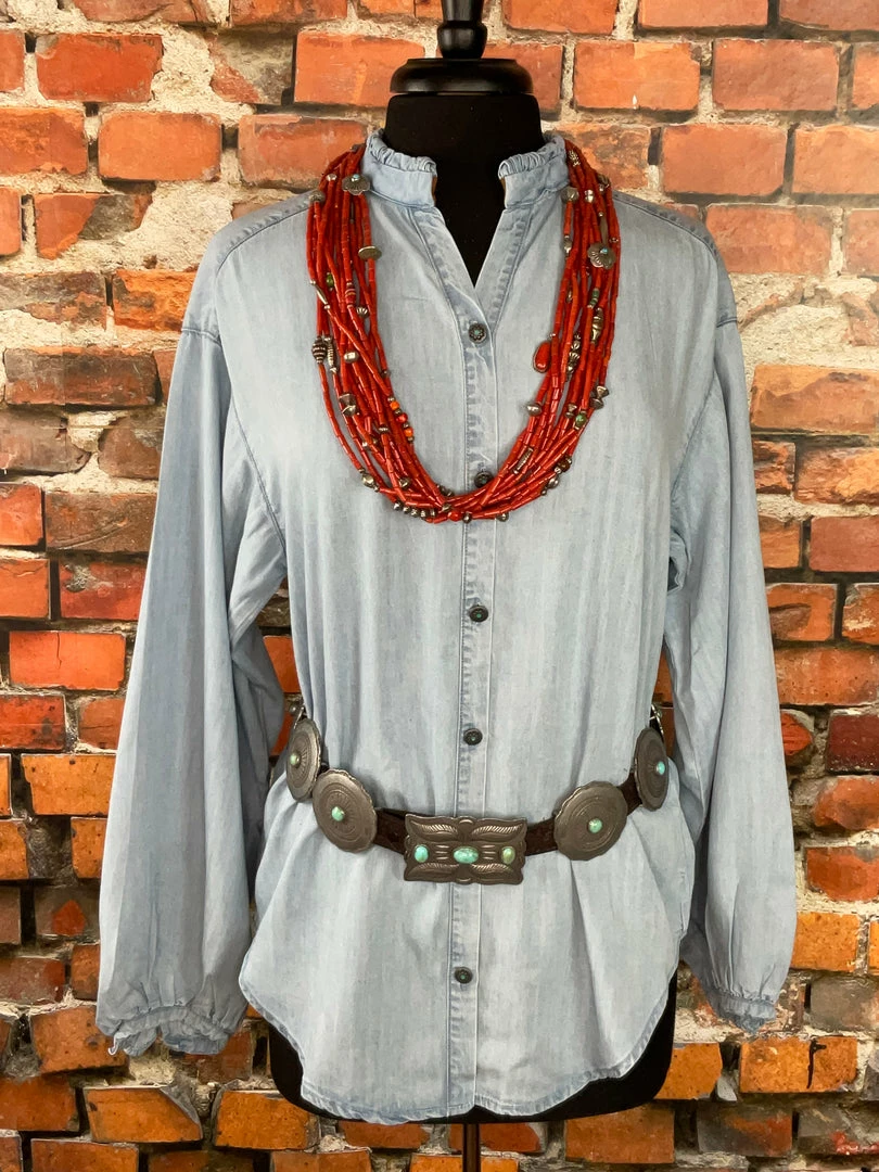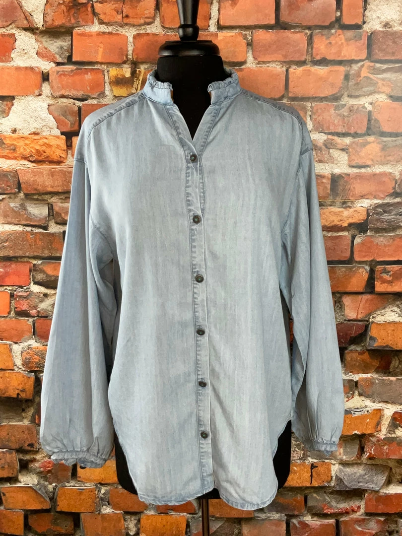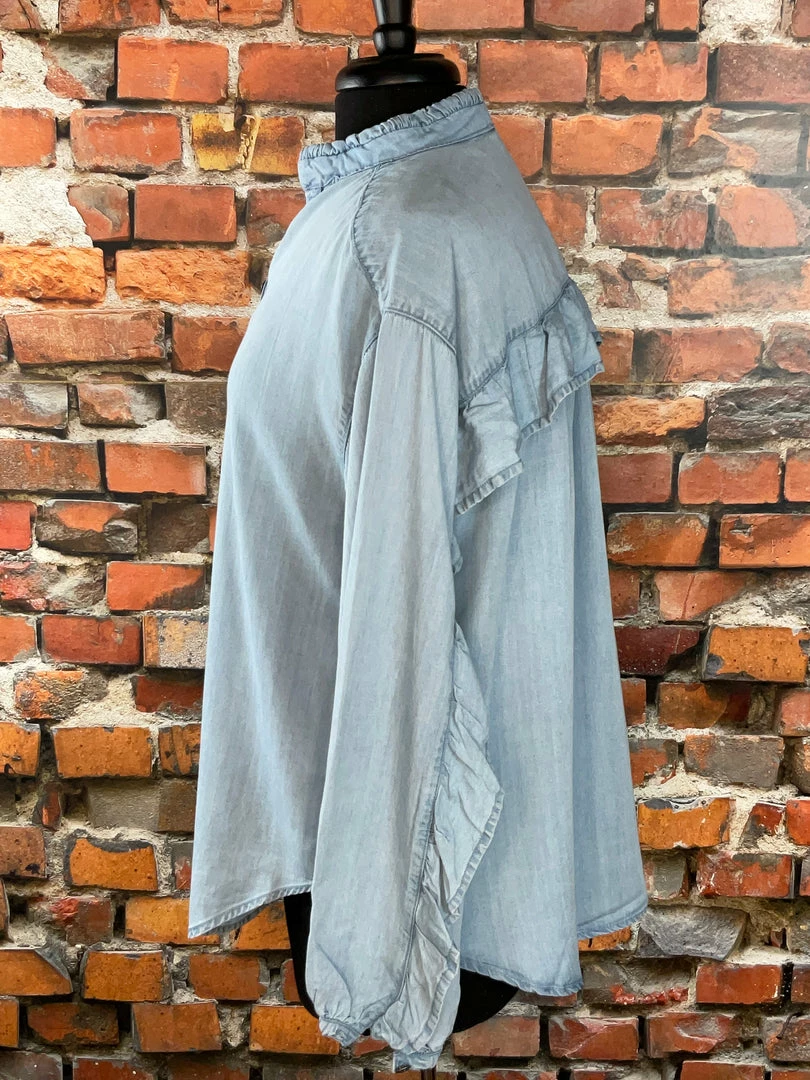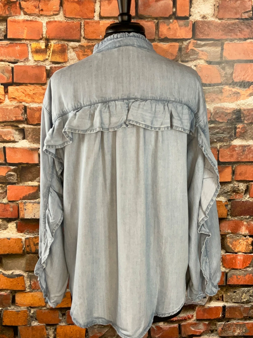 Denim says comfort all the way and the ruffle across the back of the sleeves and back say all girl! Â