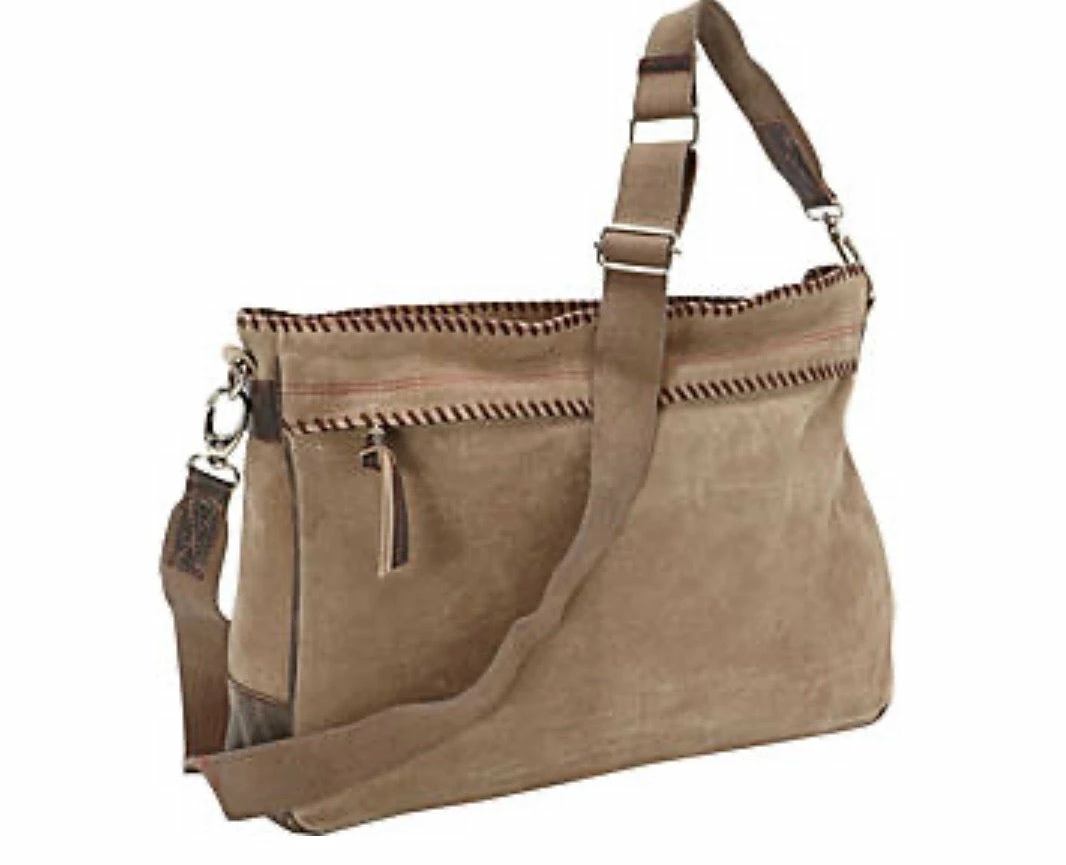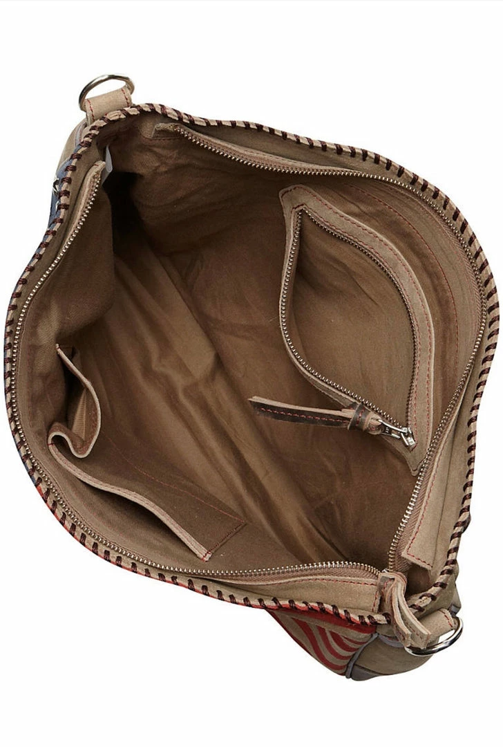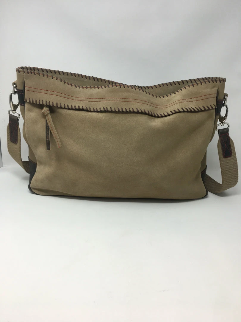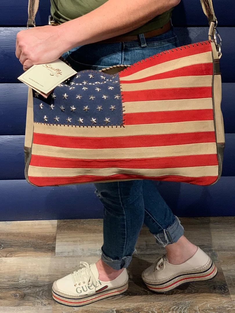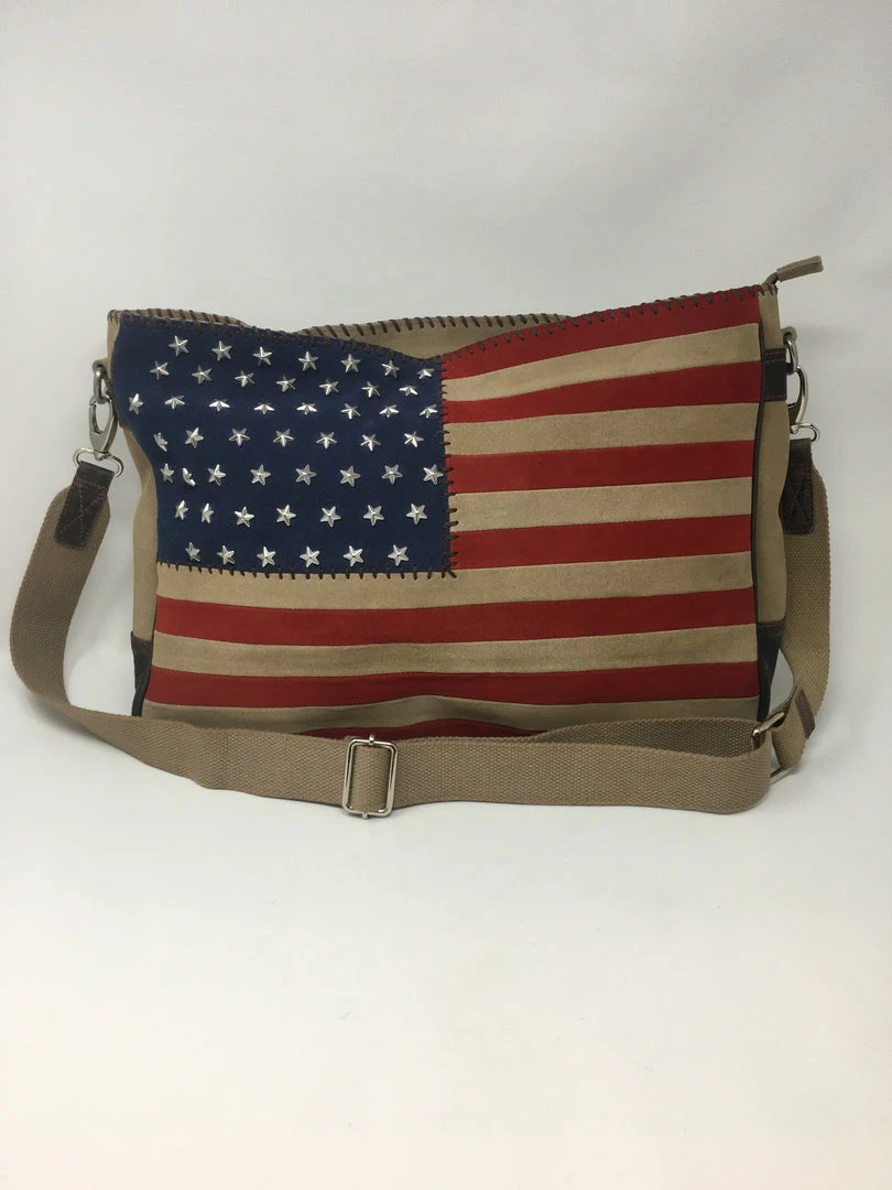 Suede flag handbag with studded stars and leather trim. Large main compartment with top zip closure. Interior zip pocket and organizing pockets. Removable and adjustable cross body leather shoulder strap.