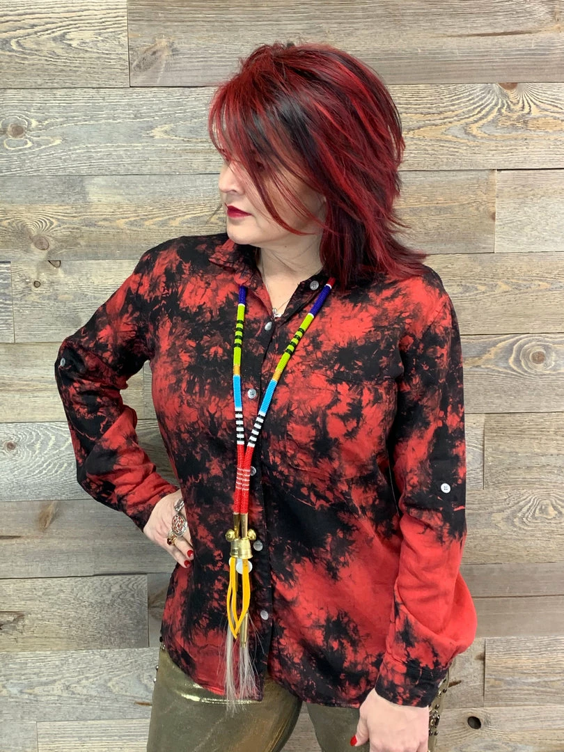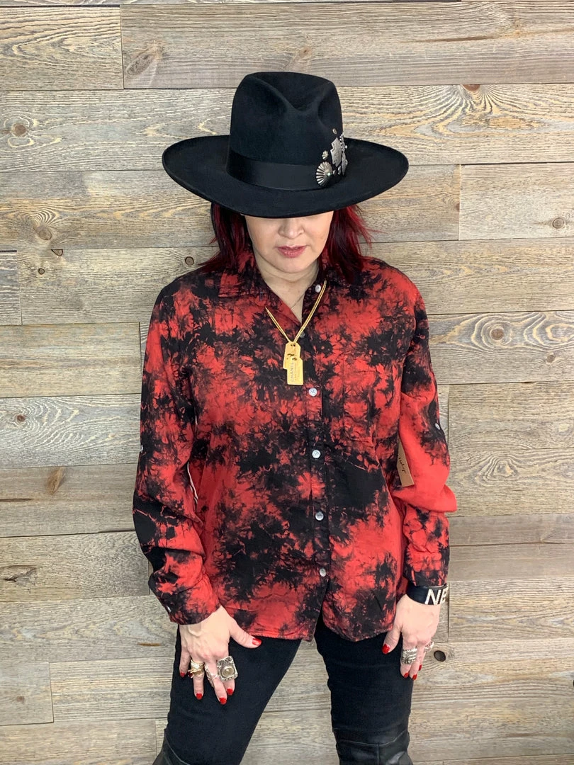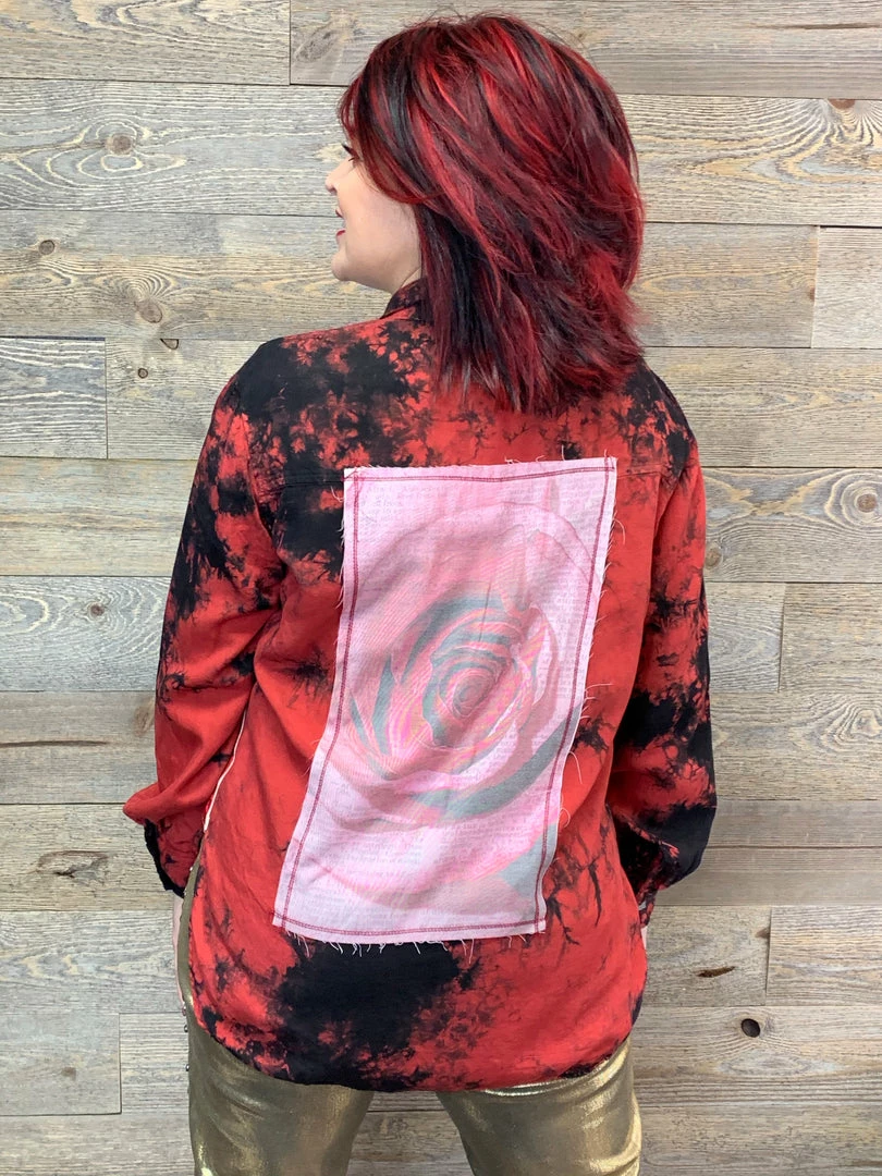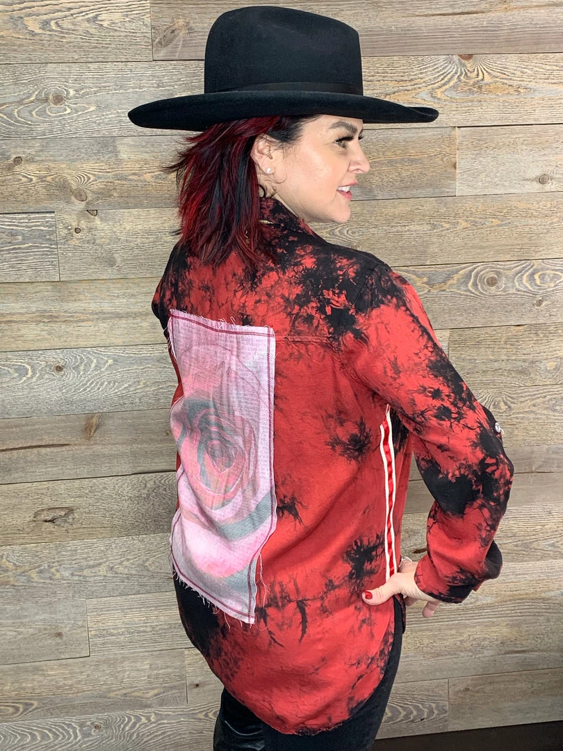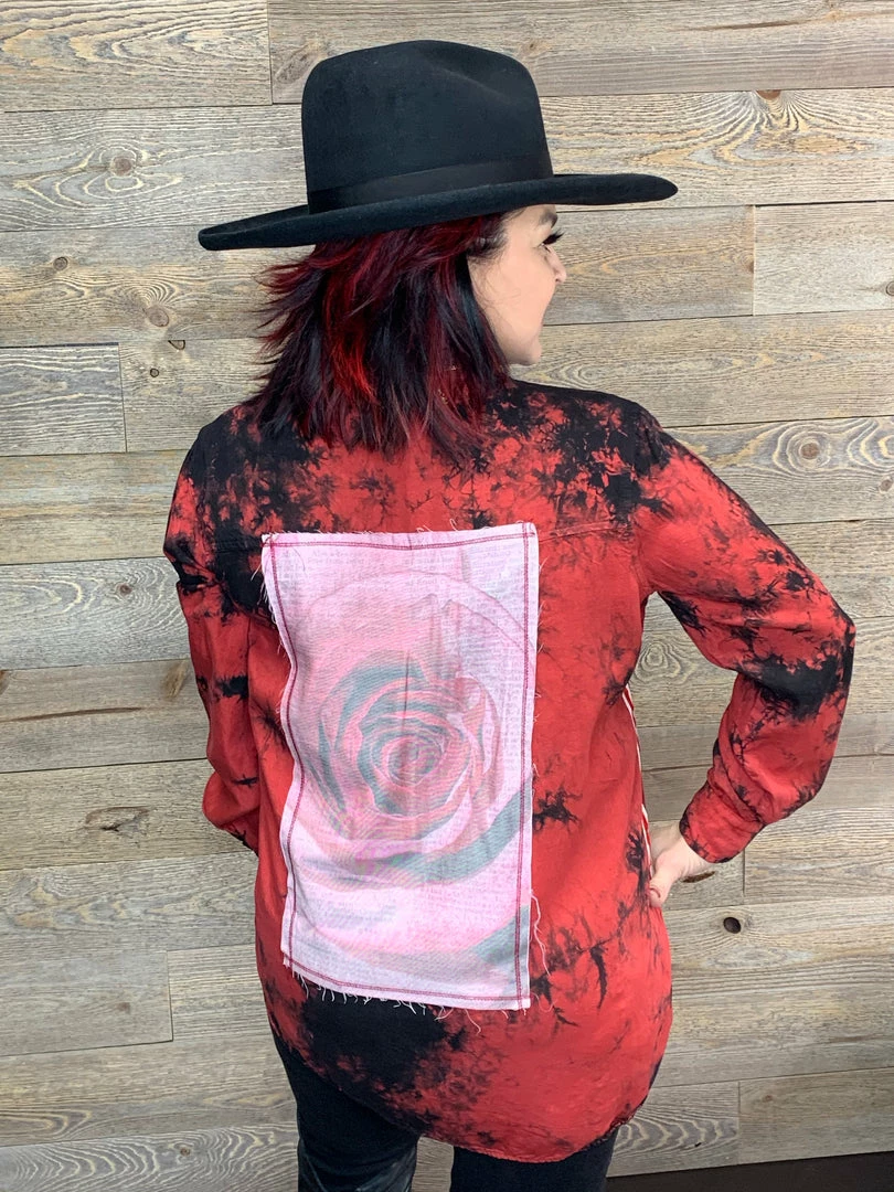 The Valentine is so pretty!!  It is a button down red & black shirt made of 100% Rayon. It has a stripe down the sides and a fabric rose design on the back. Roll up and button sleeves optional.Â