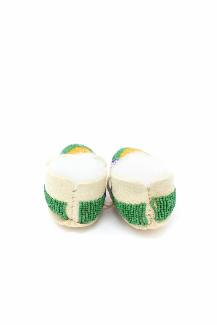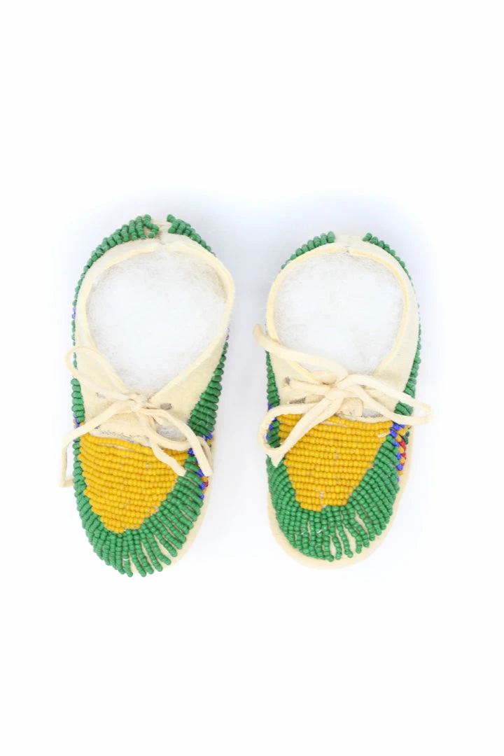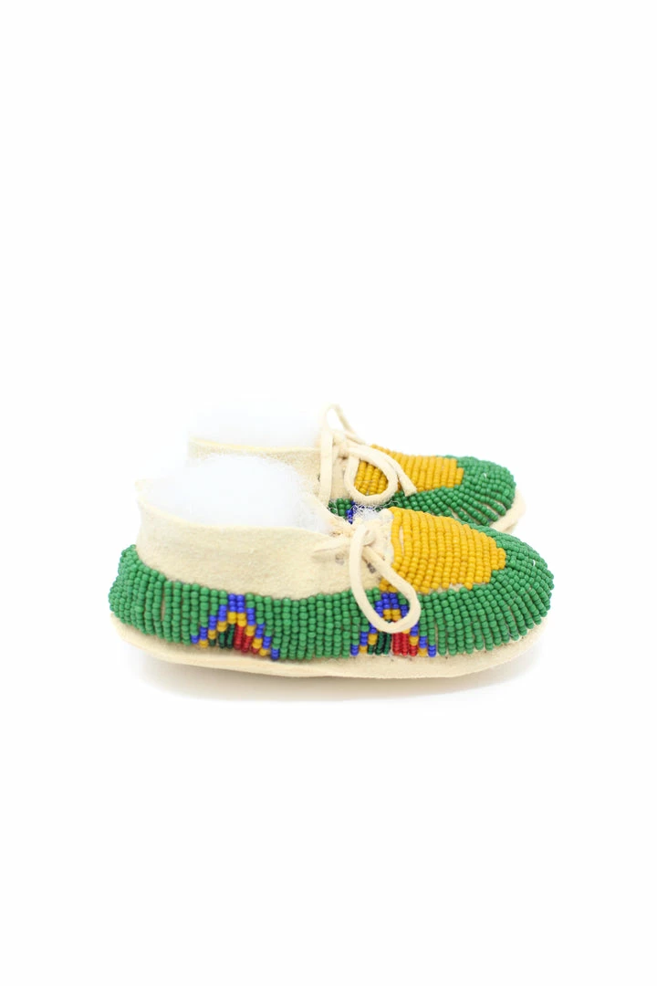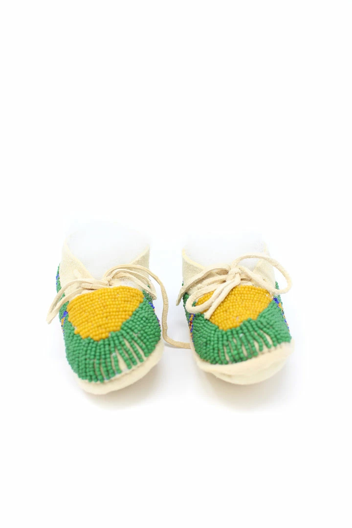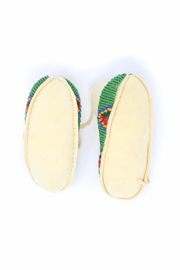 Tanned hide baby moccasins adorned with size 11/0 vintage seed beads.Â
