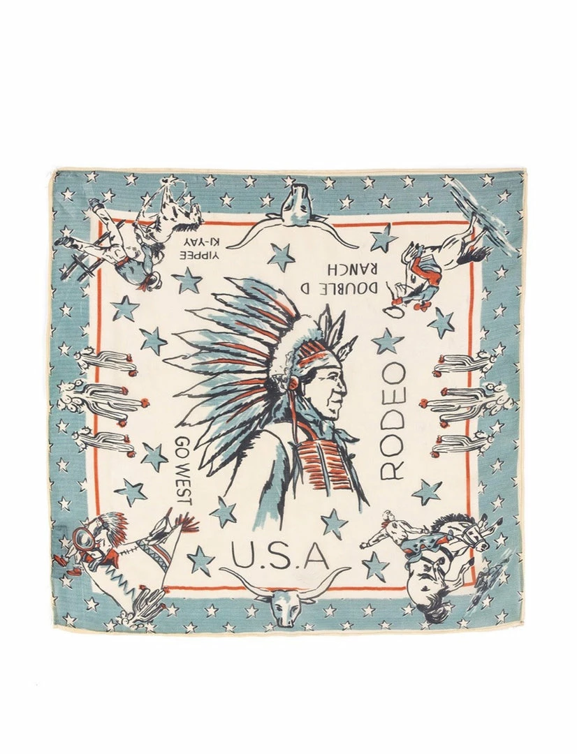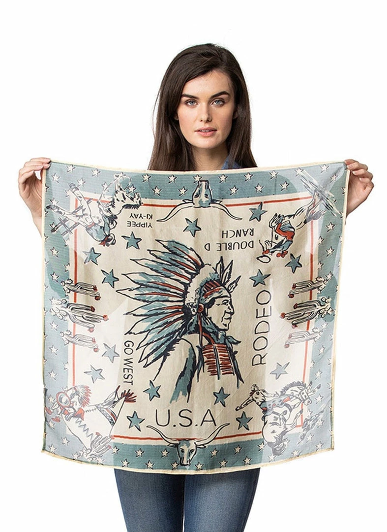 There’s a fun little backstory behind the naming of this stylish scarf:  If y’all didn’t know, Cheryl is a doodler.  Her meeting notes are always bordered by scratchy sketches and her pen is always moving.  This design is a combination of scribbled doodles of all things we love and that are so very DDR.  Centered with a prominent portrait of an Indian chieftain and bordered by a strip of stars, this fun scarf is a whimsical collaboration of both Native American and rodeo regalia in muted hues of red, white, and blue.