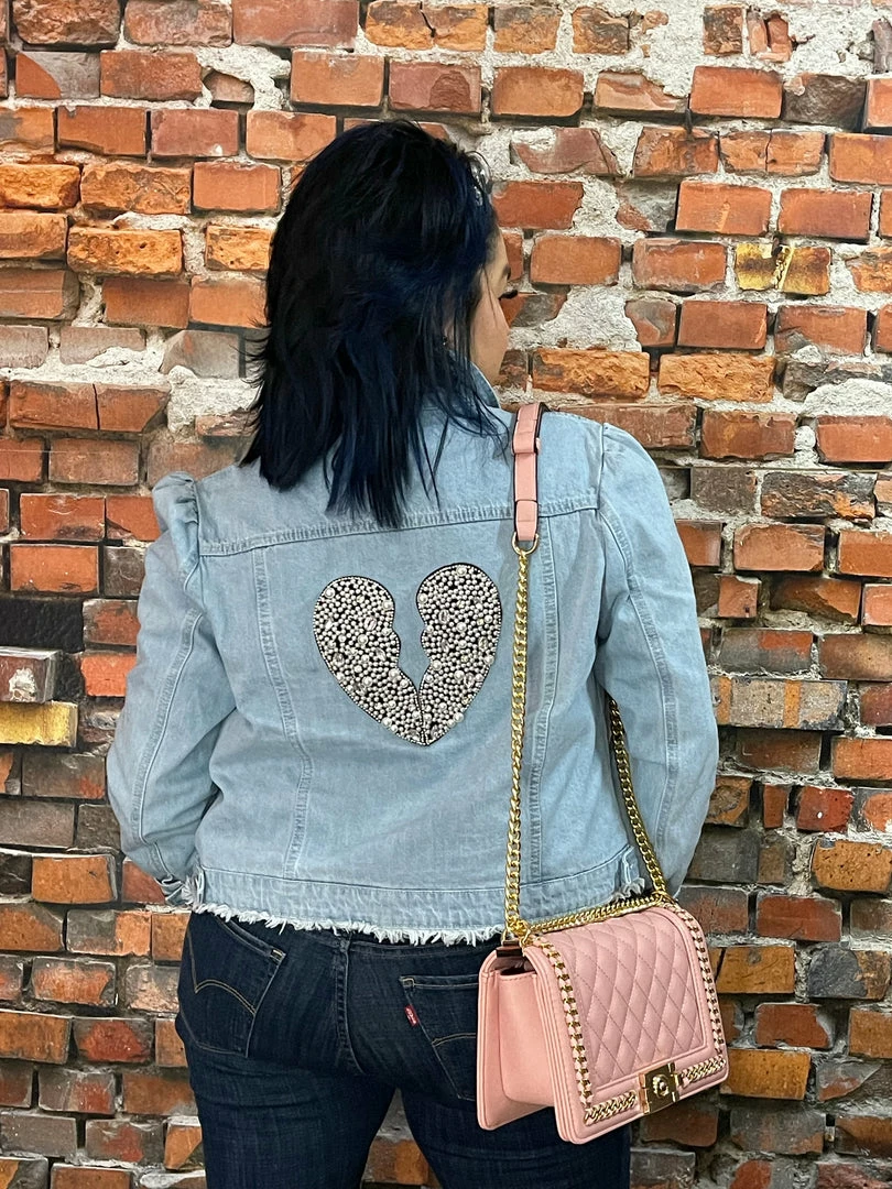 Light Blue Denim Jacket raw edge hem embellished jewel + Pearl broken heart. With an all over designer inspired lining in jacket.