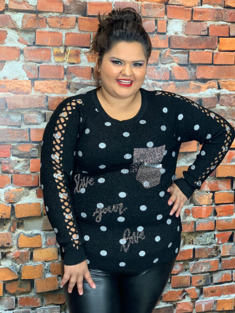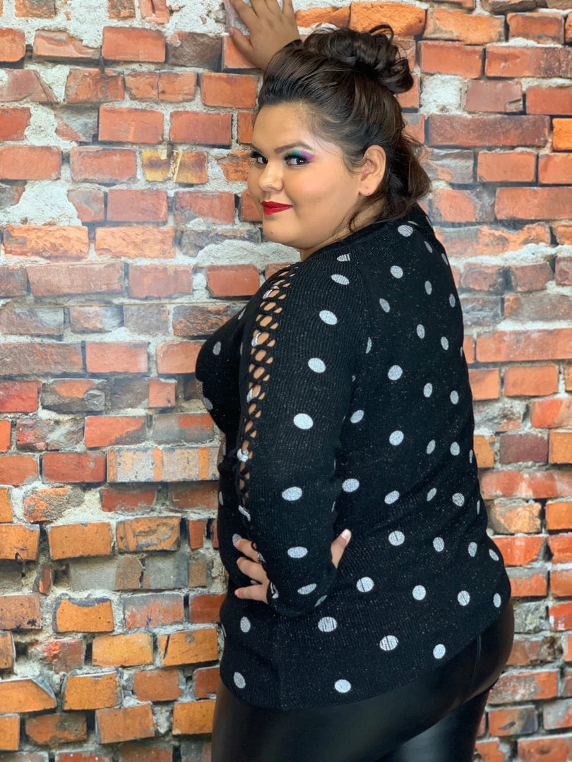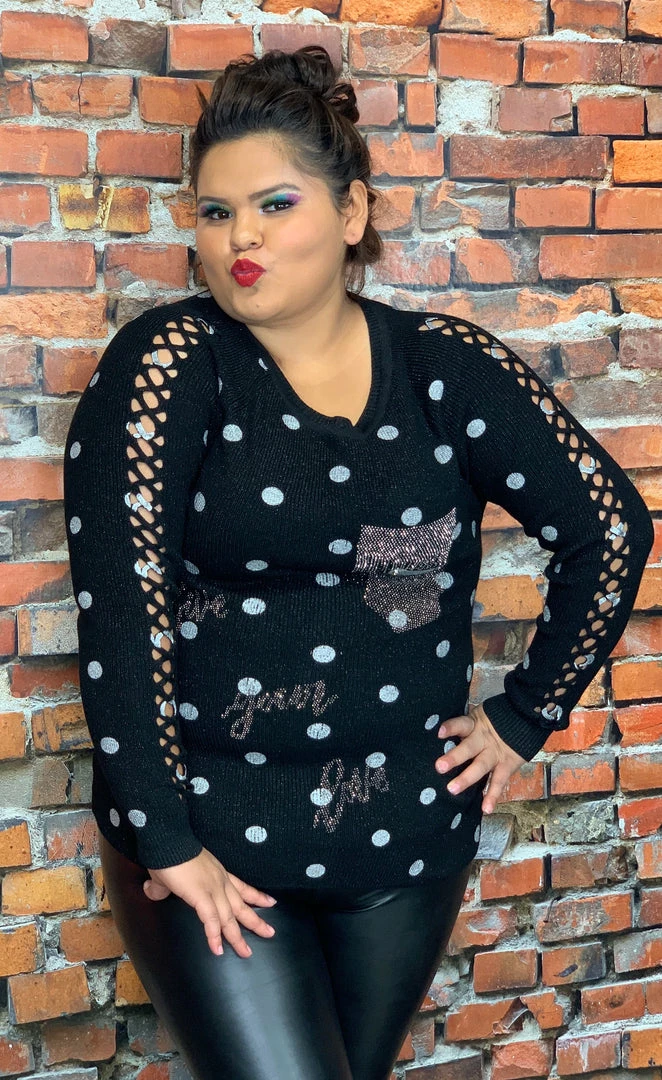 What a fun sweater! Love all the sparkles, polka dots, sparkly stones, metallic silver and the peekaboo cutouts all down the sleeve🥰🥰🥰