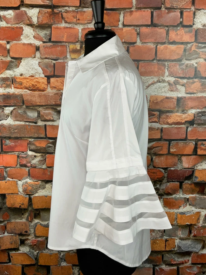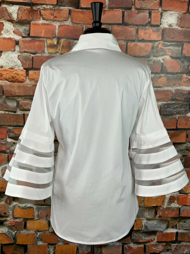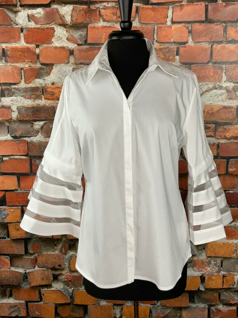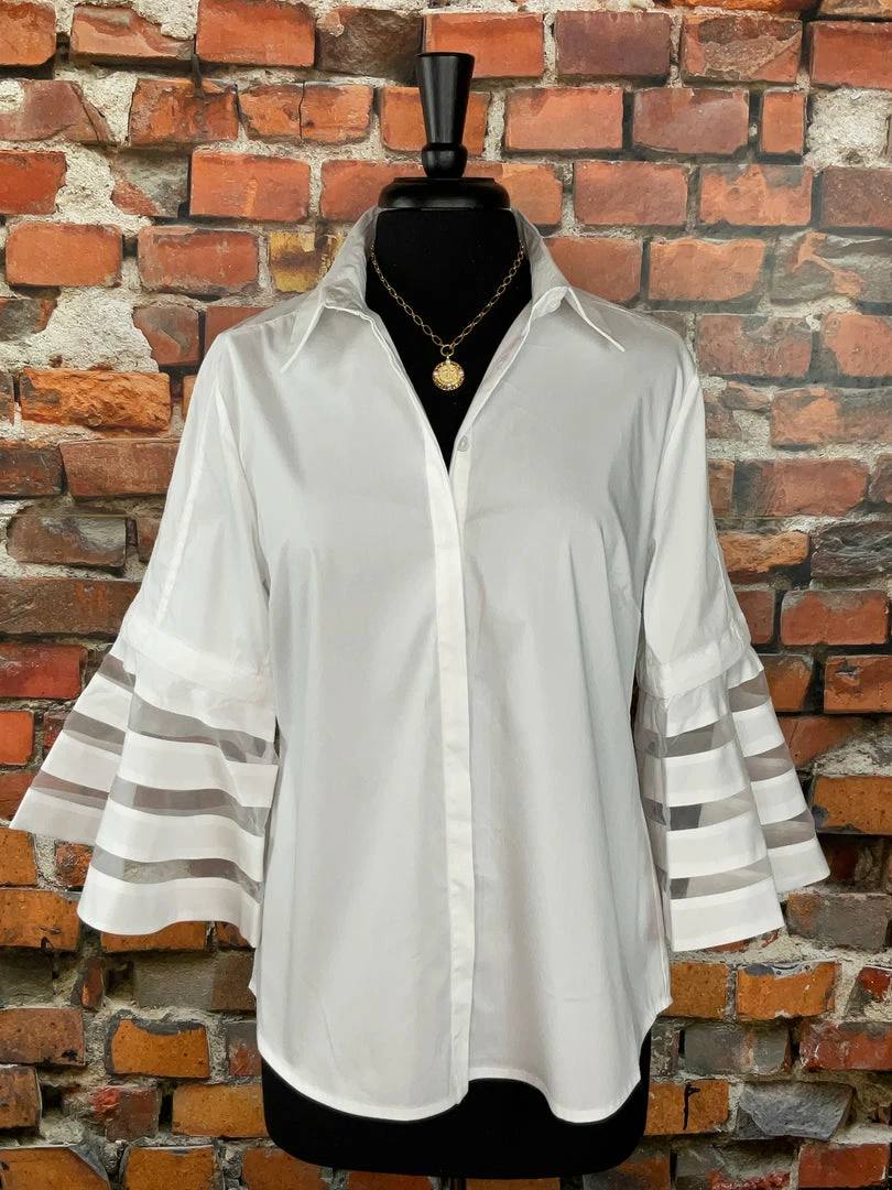 Put some flare in your business white button-up shirt! A little pizazz says you’re going a long way baby! Taylored style gives this medium Tiffiany’s wearing the perfect fit and true to size.