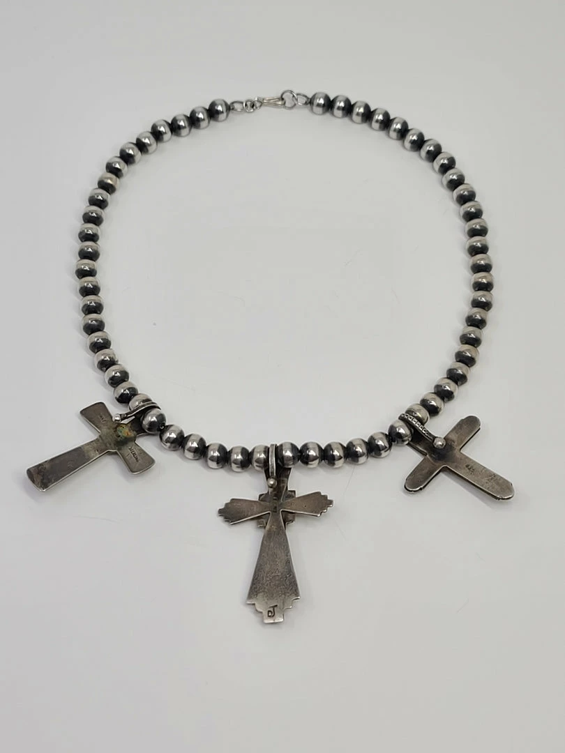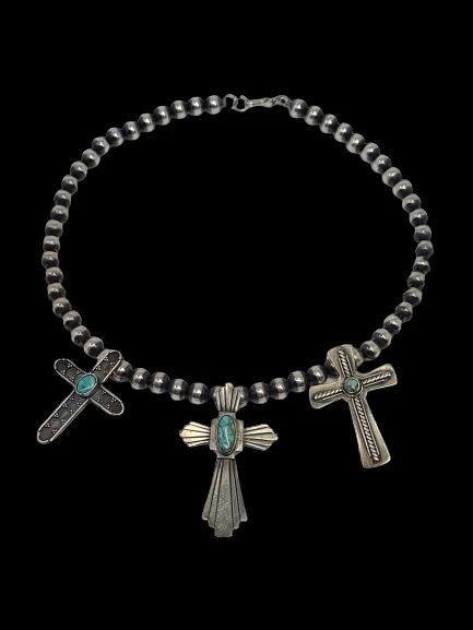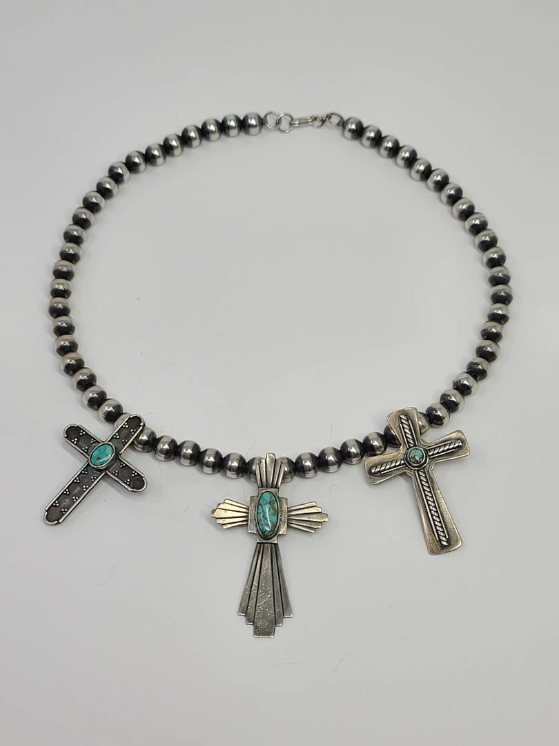 - Crosses vary in size from 1 3/4″ – 2 1/4″ Long x 1 1/4″ – 1 1/2″ Wide and are made of sterling silver with a turquoise stone.
