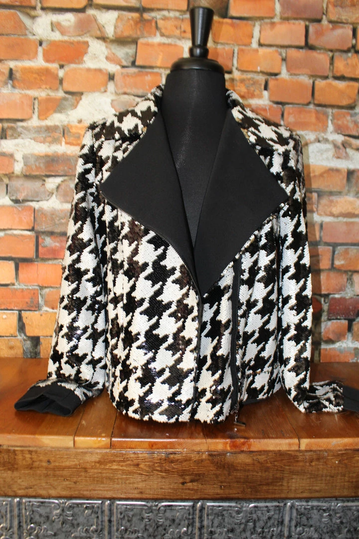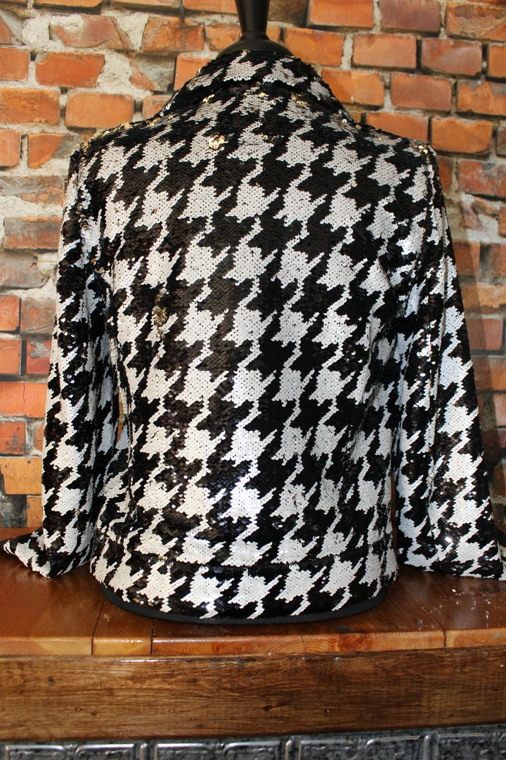 Black & Ivory sequins never looked so good together. The pattern and style of this jacket says “smart and sassy” all the way! Â