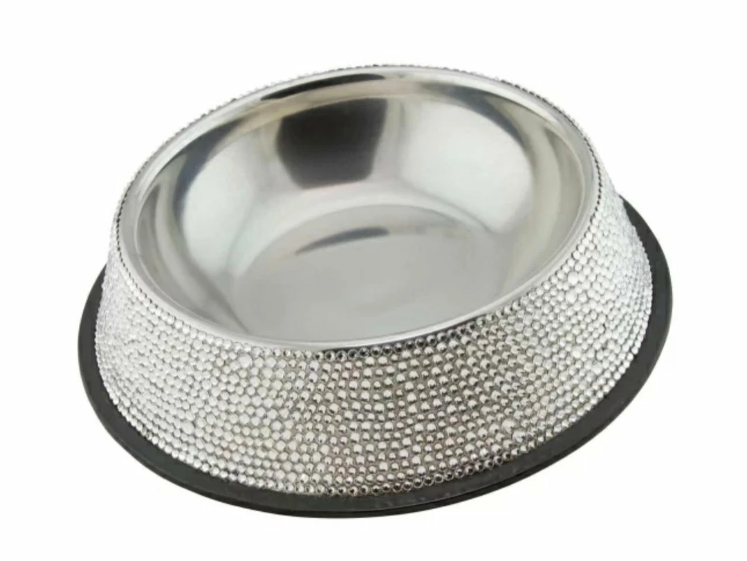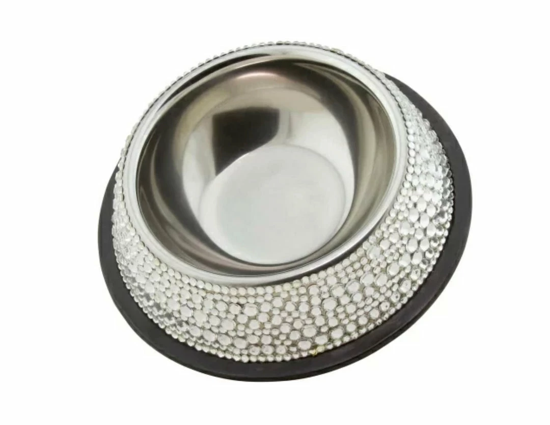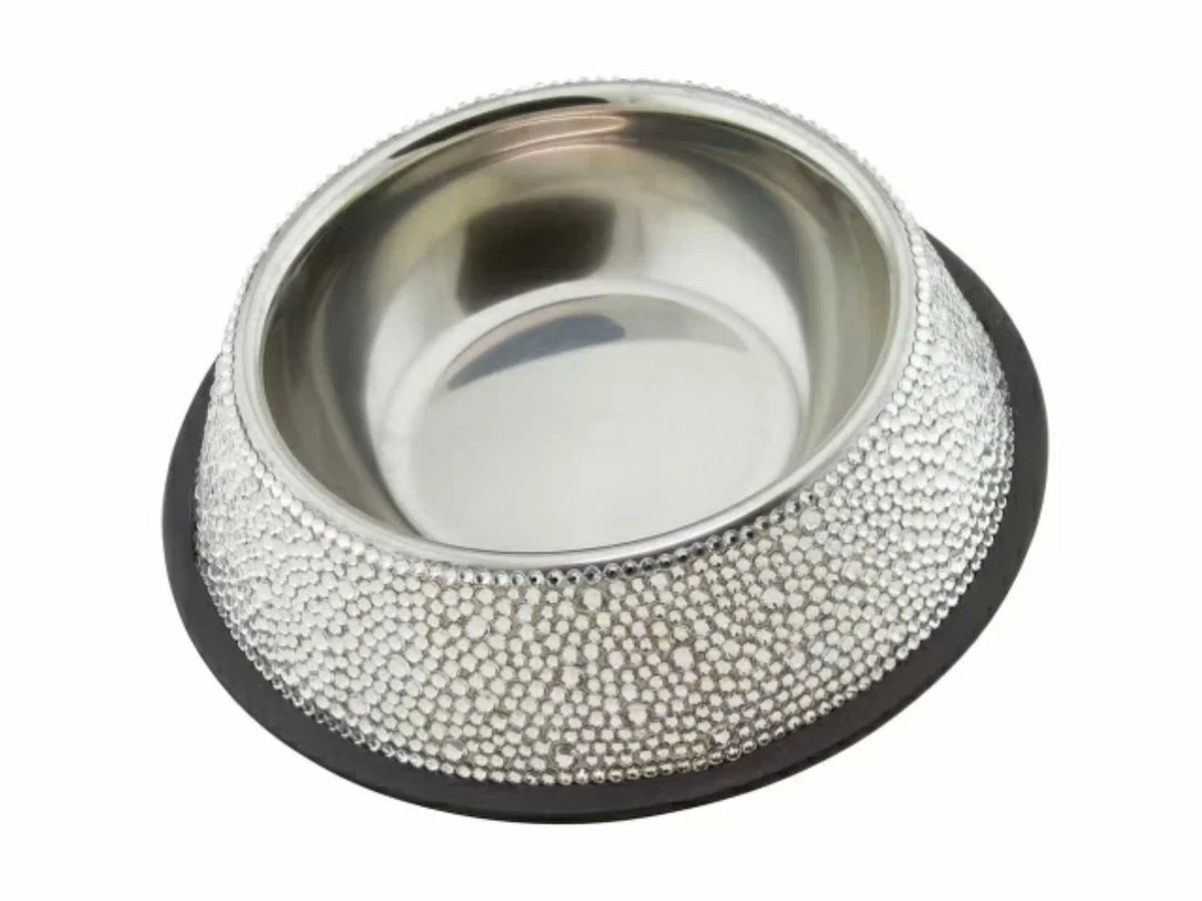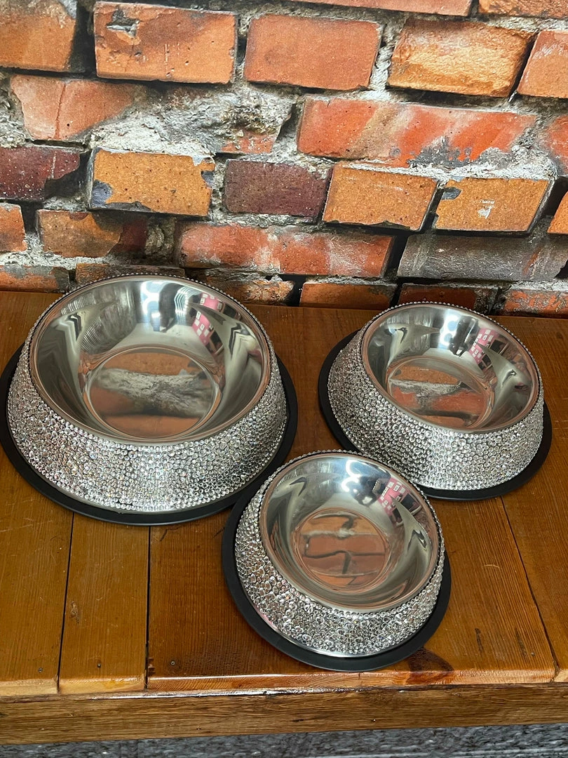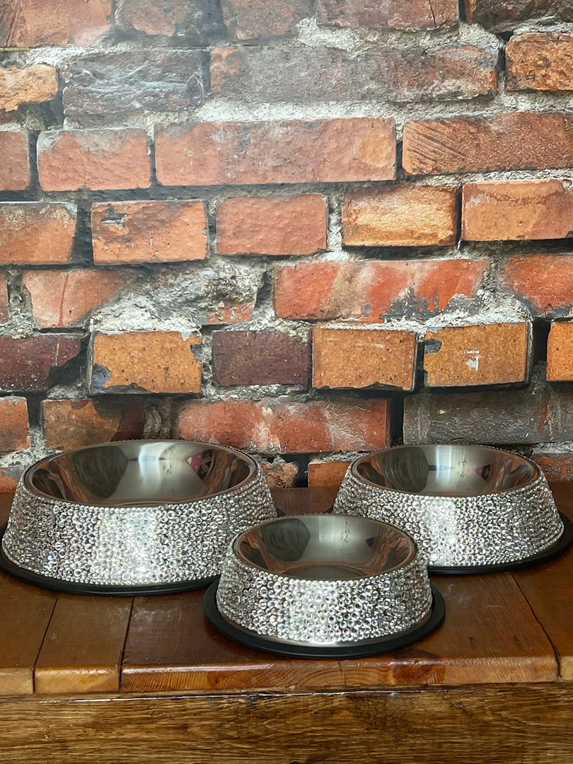 Bling our your pooch with our hand-stoned dog bowls. Set with crystal rhinestones on a stainless steel bowl.
