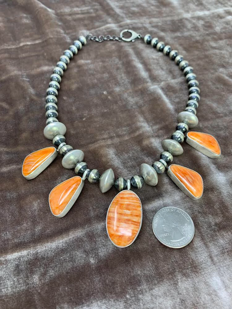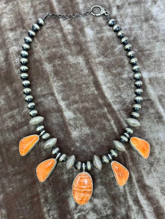 This necklace is even more stunning in person. Featuring 5 spiny oyster cabs strung along with Navajo pearls.